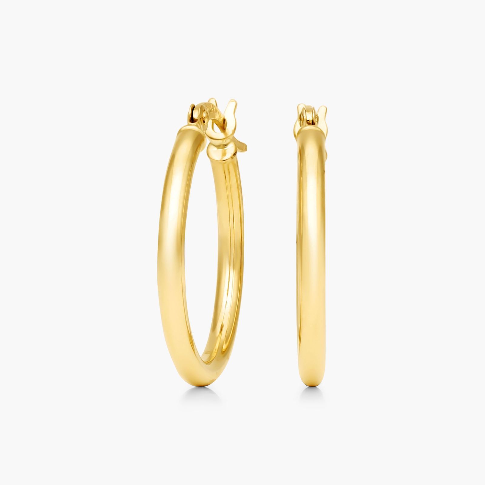 A jewelry essentials box is never complete without gold hoops. These lightweight 0.8 inch hoop earrings are crafted in 14K gold 2mm tubing to keep your ears comfortable. These classic yet versatile earrings are secured with a snap bar closure.