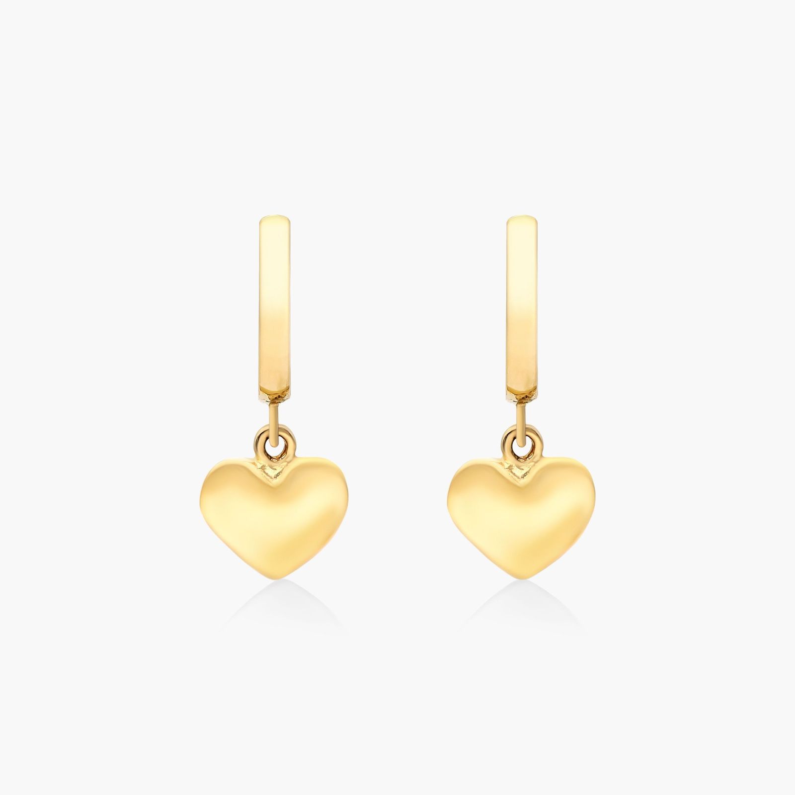 Dangle Puffed Heart Hoop Earrings In 14K Yellow Gold