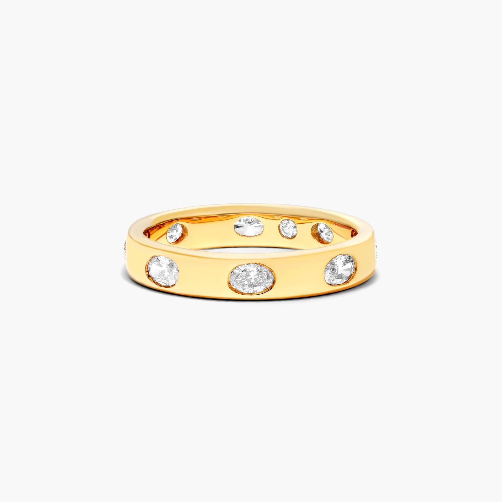 The smoothness of the metal is highlighted by the sparkle of the diamonds. Wear it alone or up the sparkle by pairing it with multiple stackable rings.