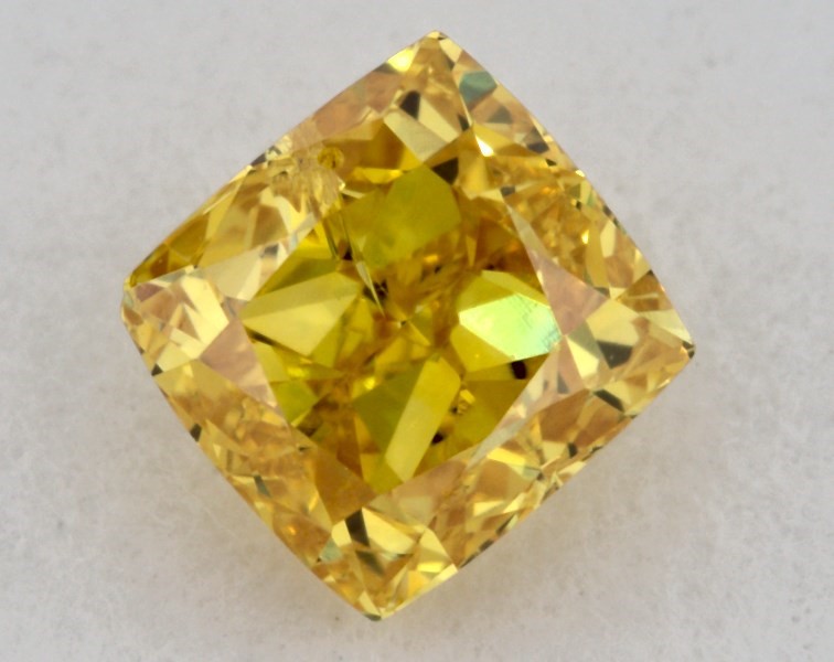 This cushion cut 0.32 carat Fancy Vivid Yellow color CO clarity has a diamond grading report from GIA