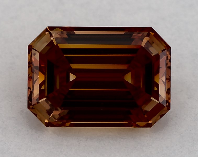 This Lab-Grown diamond emerald cut 0.74 carat Fancy Intense Brownish Orange color VS1 clarity has a diamond grading report from IGI