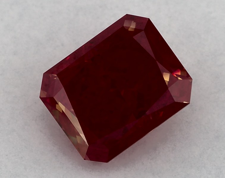 This Lab-Grown diamond radiant cut 1.56 carat Fancy Red color VS1 clarity has a diamond grading report from IGI