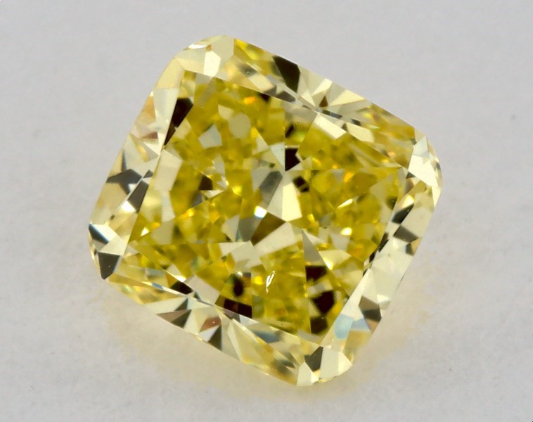 This cushion modified cut 0.79 carat Fancy Intense Yellow color VS2 clarity has a diamond grading report from GIA
