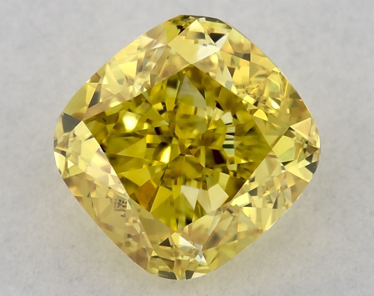 This Lab-Grown diamond cushion cut 0.85 carat Fancy Intense Yellow color VVS2 clarity has a diamond grading report from IGI
