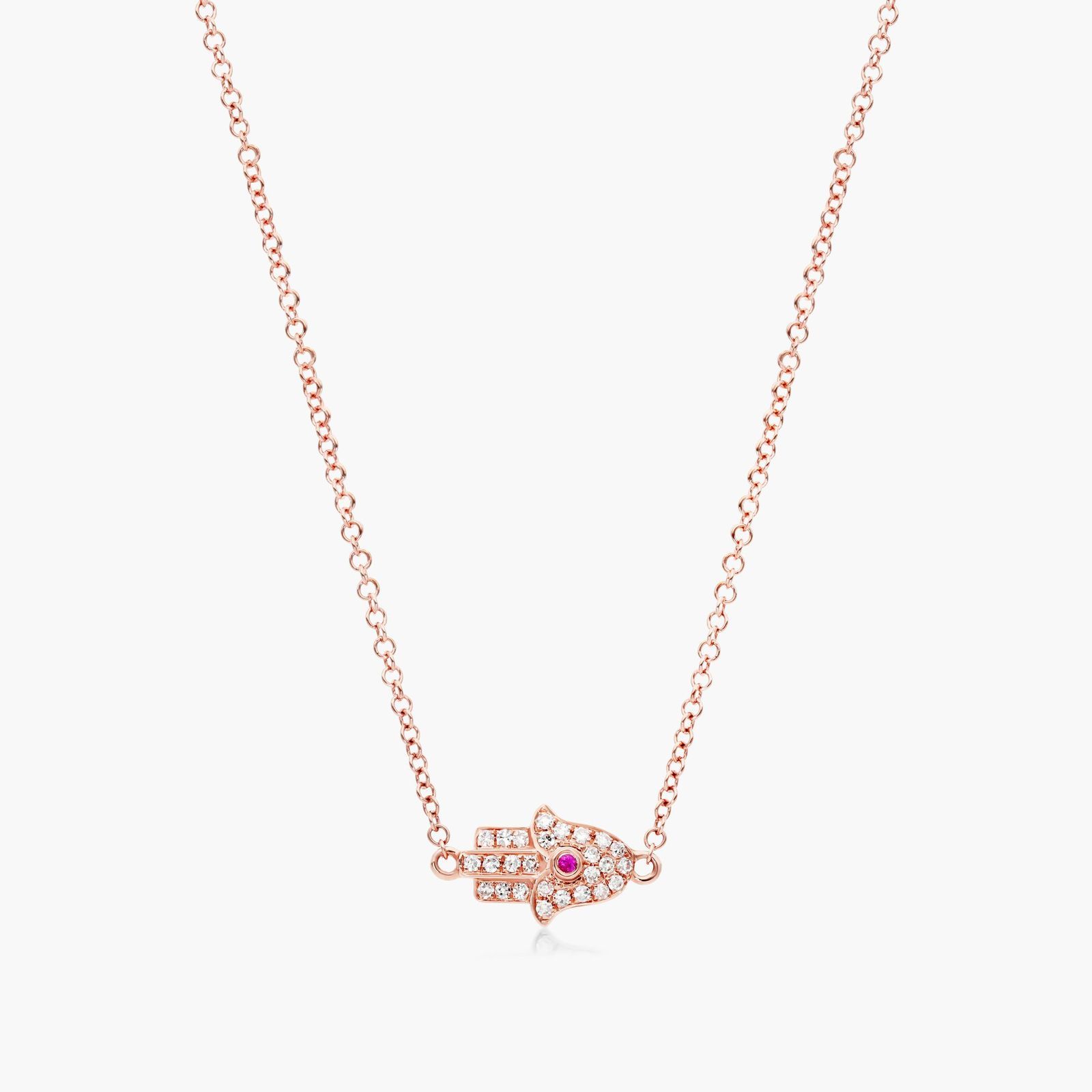This delicate Hamsa pendant studded with diamonds makes for a clean and modern look. Horizontally set and studded with a ruby at its center, this necklace is a contemporary take on a timeless piece perfect for everyday wear.