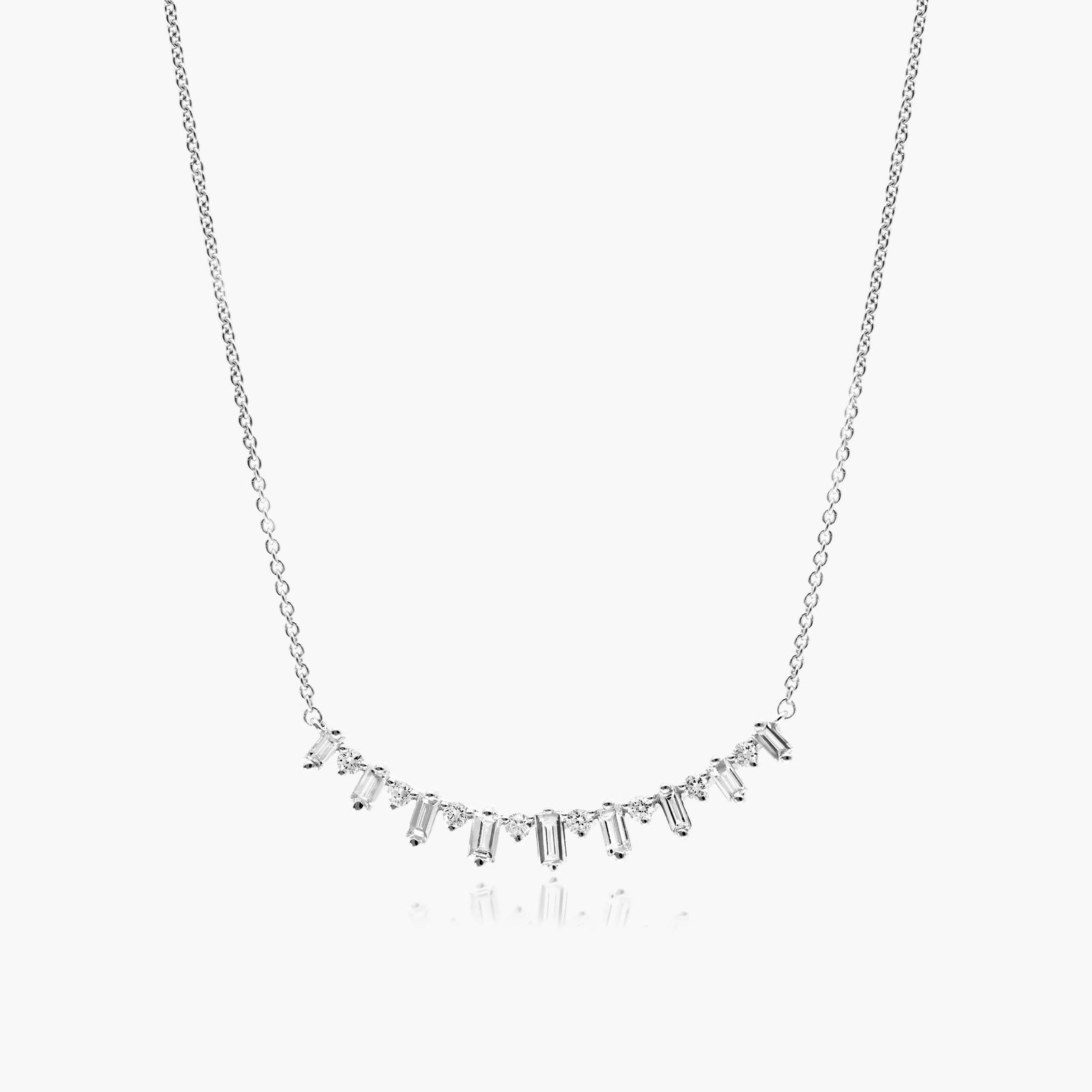 Curving Diamond Bar Necklace With Alternating Round And Baguette Cut Diamonds In 14K White Gold