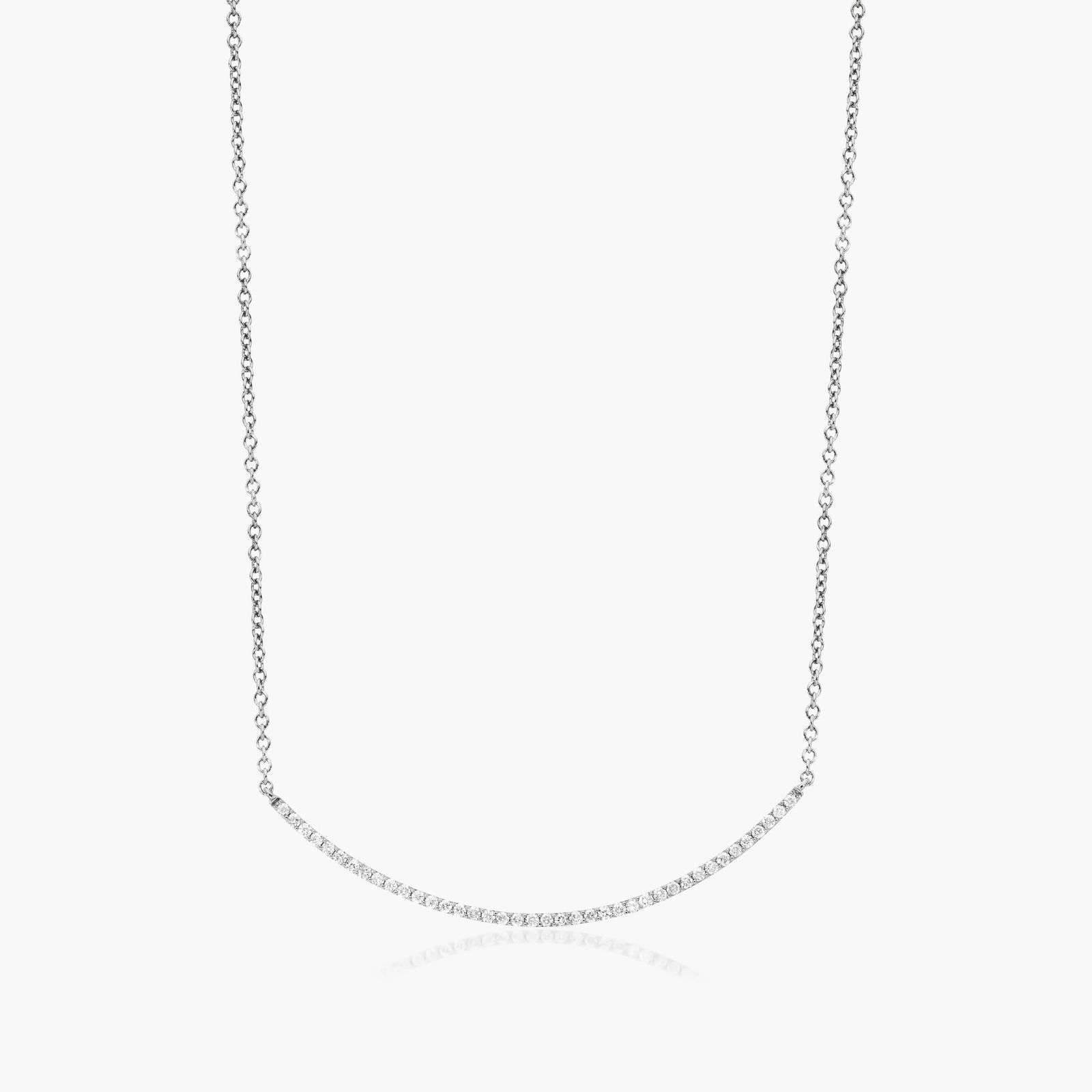 This delicate necklace featuring a subtly curved bar of round-cut pavé diamonds set in 14K white gold is beautifully understated to compliment any look. Gift this timeless piece to the special someone in your life.