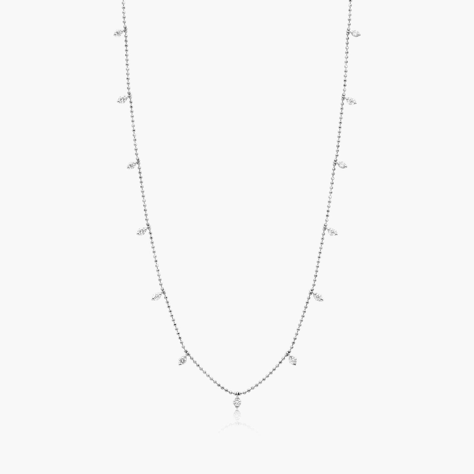 This 14K white gold necklace features round-cut prong set diamonds stationed along a faceted bead chain, giving this piece a twinkling effect and ethereal quality. Pair this necklace with any look to add understated elegance and sparkle.