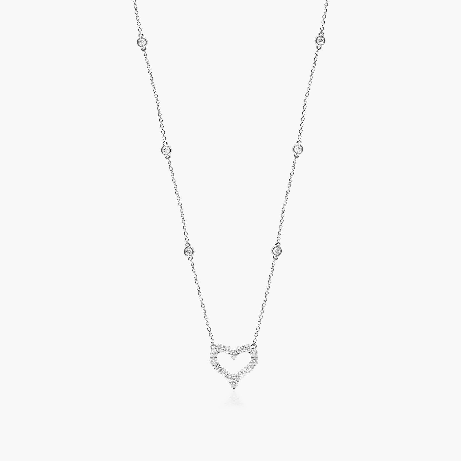 This gorgeous 14K white gold necklace features a heart outline pendant made of sparkly diamonds and bezeled diamond stations as sparkly accents. The perfect token of affection for that special someone.