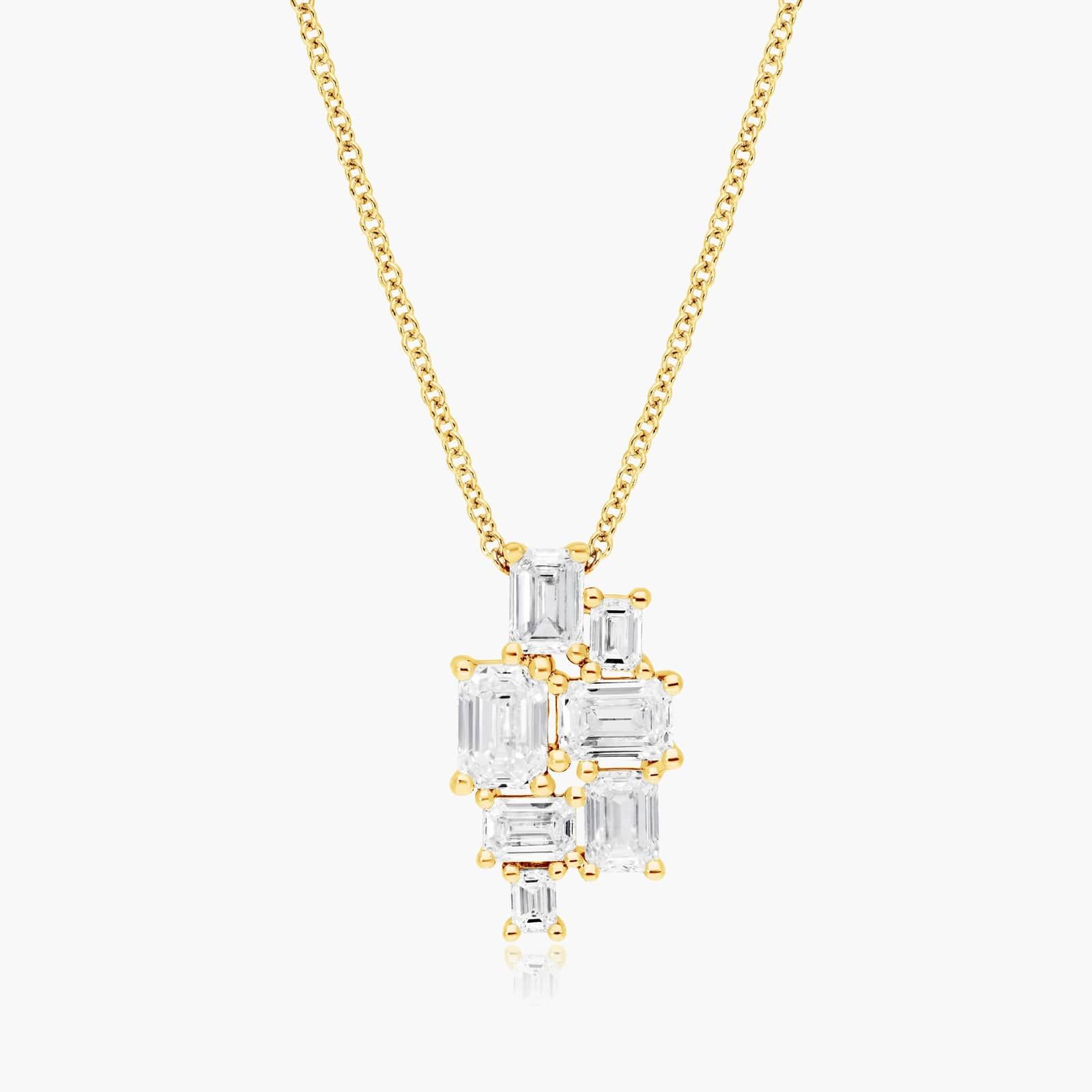 This trendy pendant features multiple emerald shaped lab grown diamonds in a cluster pattern. Available in 16 and 18 inches in length, this necklace secures with a lobster claw clasp. Give your look just the right amount of sparkle with this gorgeous pendant.