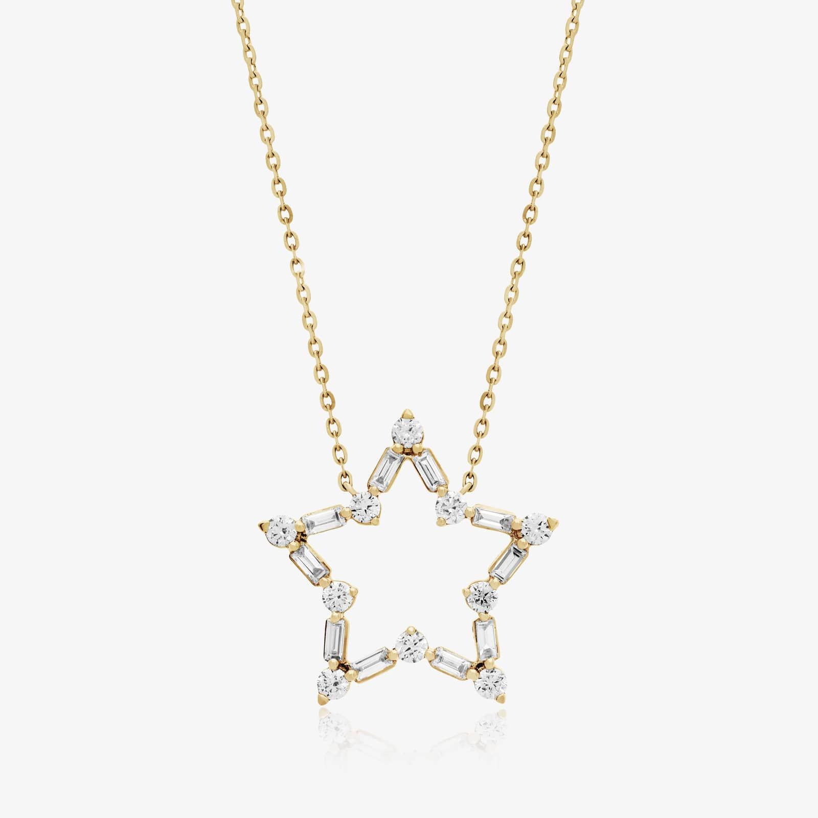 This beautiful necklace features a star shape with baguette and round diamonds set in an alternating fashion. This necklace is as fun and cute as it is stunning. Whether for every day or a special event, this necklace will have you shining bright.