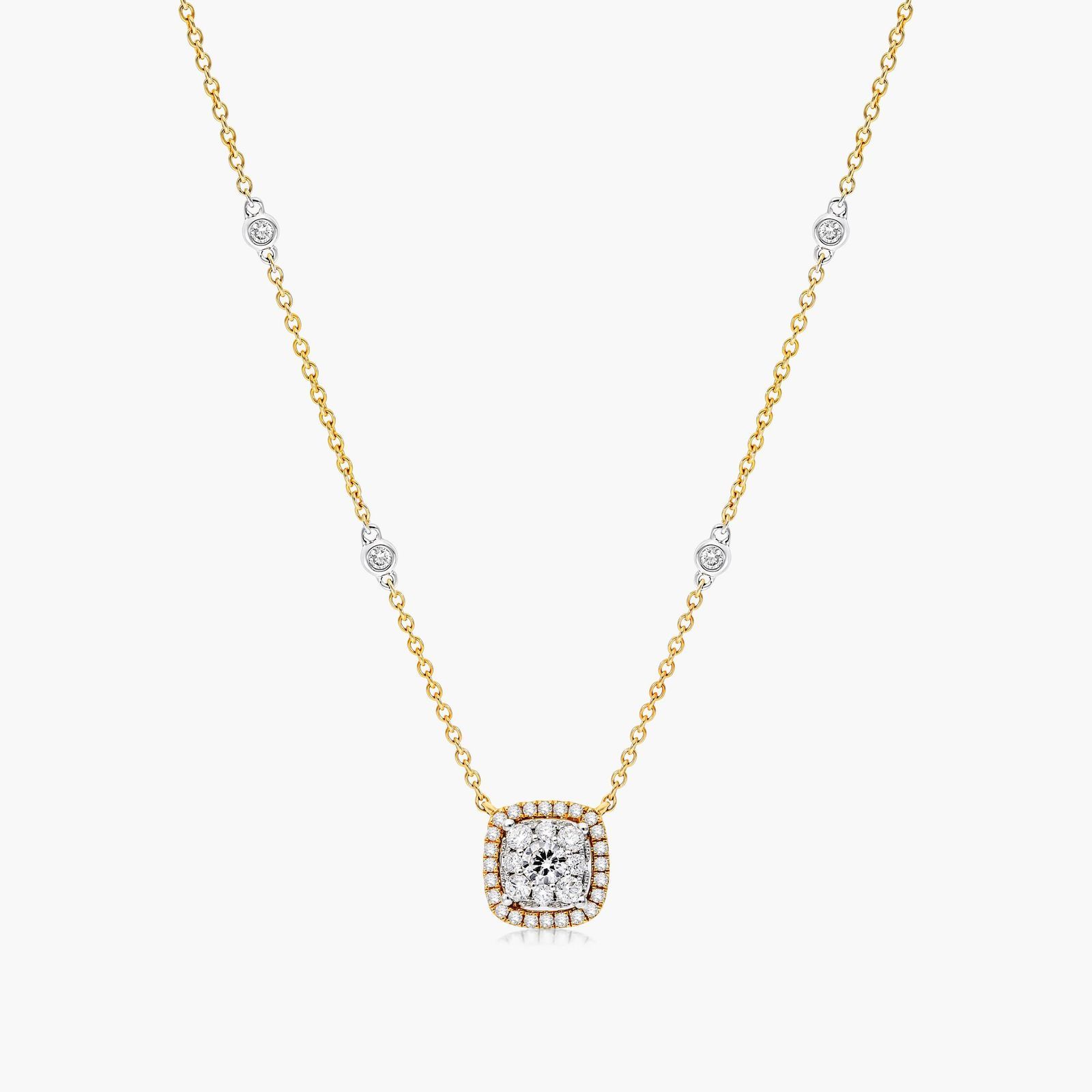 This dainty and elegant cushion halo composite pendant is perfect for every day wear. Beautifully crafted and prong set with round brilliant cut diamonds. Suspended by a delicate adjustable chain with four stations of round brilliant cut diamonds bezel set.
