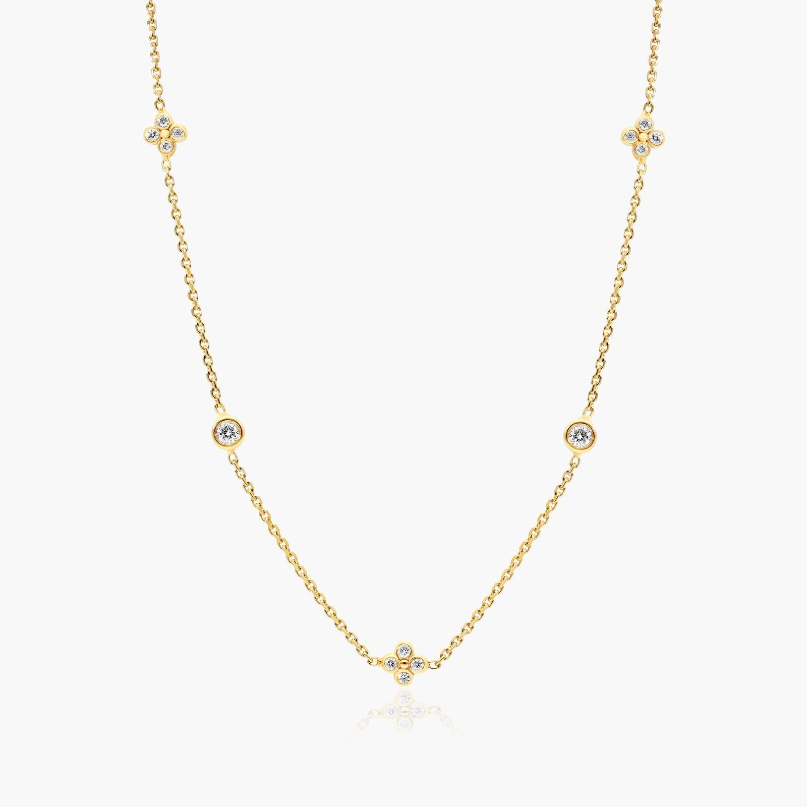 Classic gold meets dazzling diamonds to devise this chic creation that will ALWAYS be in style. Alternating diamond clusters are stationed on a 16 inchdiamond cut cable chain with 2" extende.