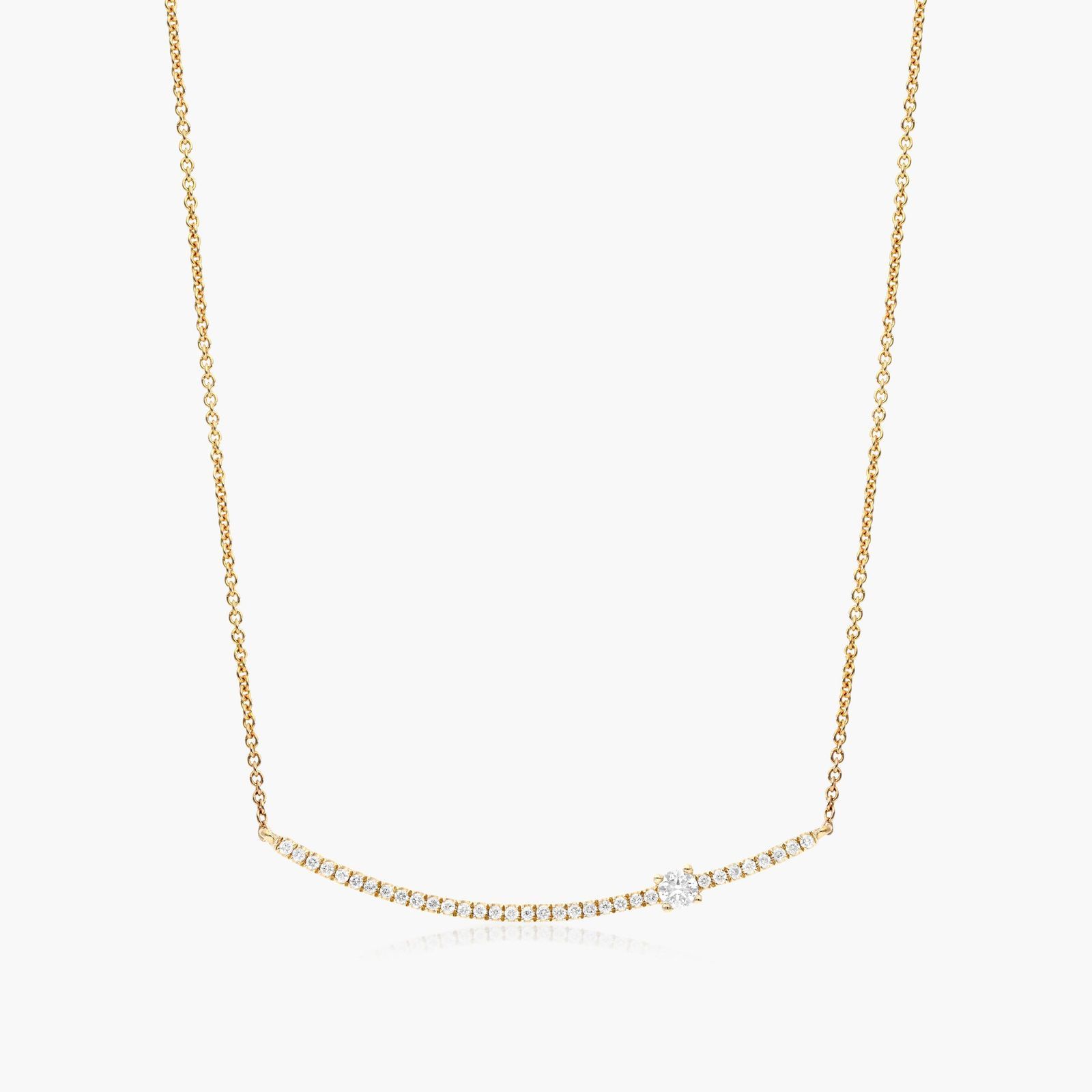 This delicate necklace featuring a subtly curved bar of round-cut pavé diamonds set in 14K yellow gold is beautifully understated to compliment any look. A brilliant, round-cut diamond offset on the bar gives this necklace a unique element, making this piece even more special for your special someone