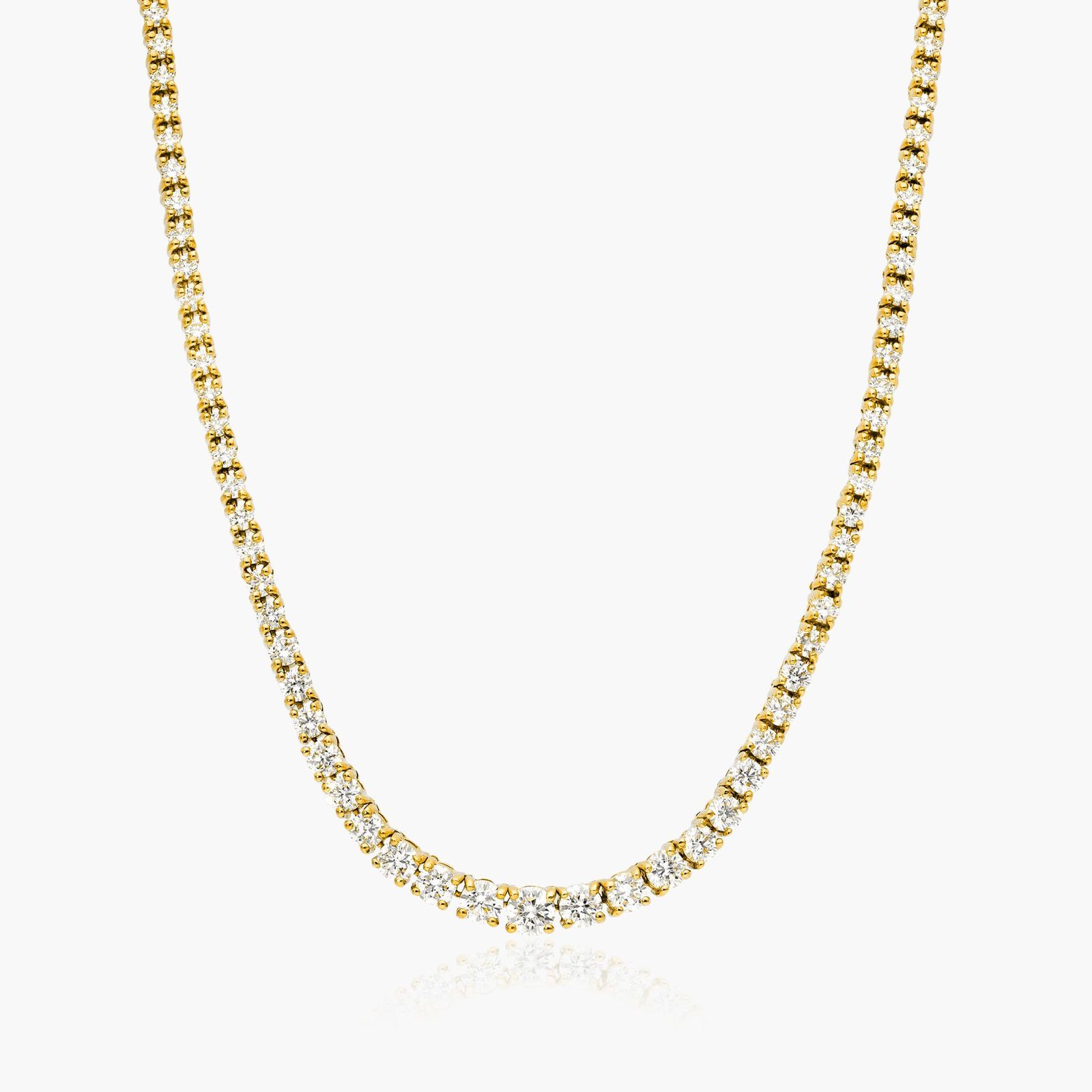 A row of scintillating round brilliant diamonds gracefully graduate towards the center to create this spectacular piece that will stand the test of time. This classic tennis necklace secures with a box clasp.