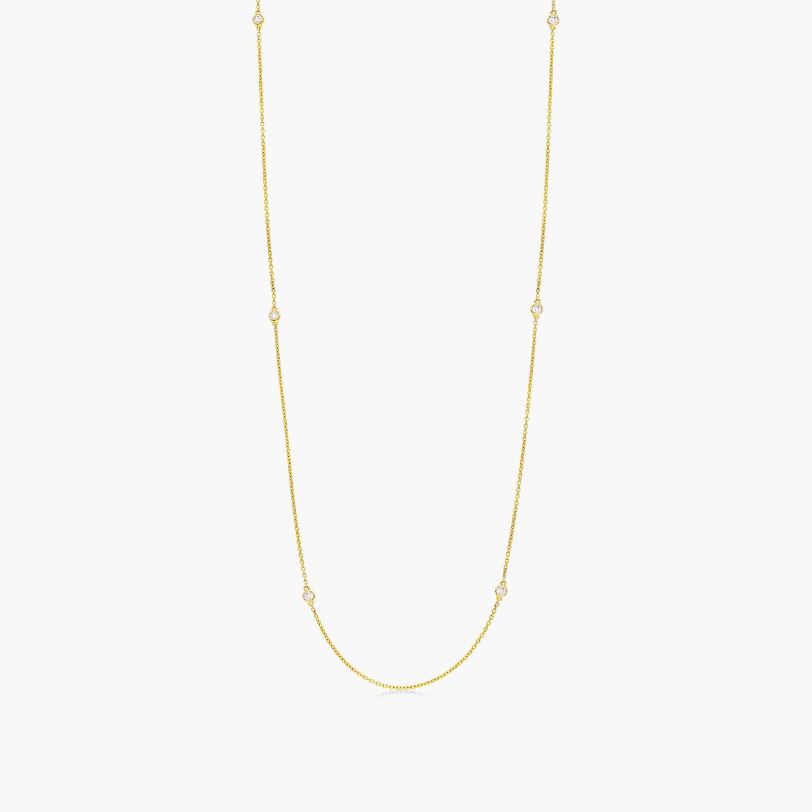 A delicate and sophisticated diamond by the yard necklace. It features Six diamond stations bezel set in a gold setting. Its is a perfect gift for a special occasion.