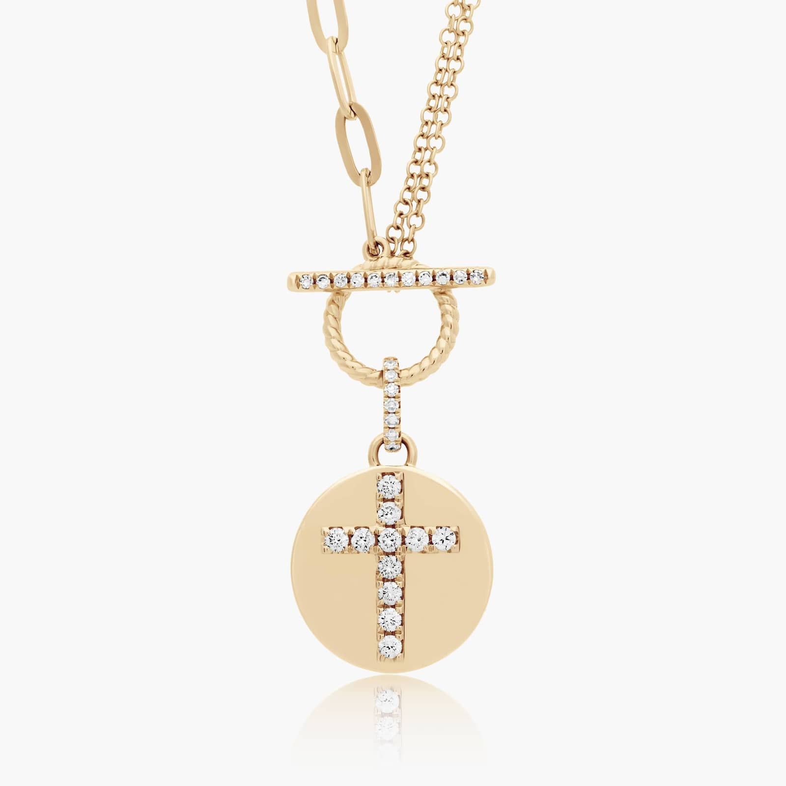 Featuring a cross designed in dazzling diamonds, on a beautiful gold toggle clasp necklace, this necklace is perfect for evey day. Wear this versatile necklace everywhere and celebrate your faith while expressing your style in this timeless piece.