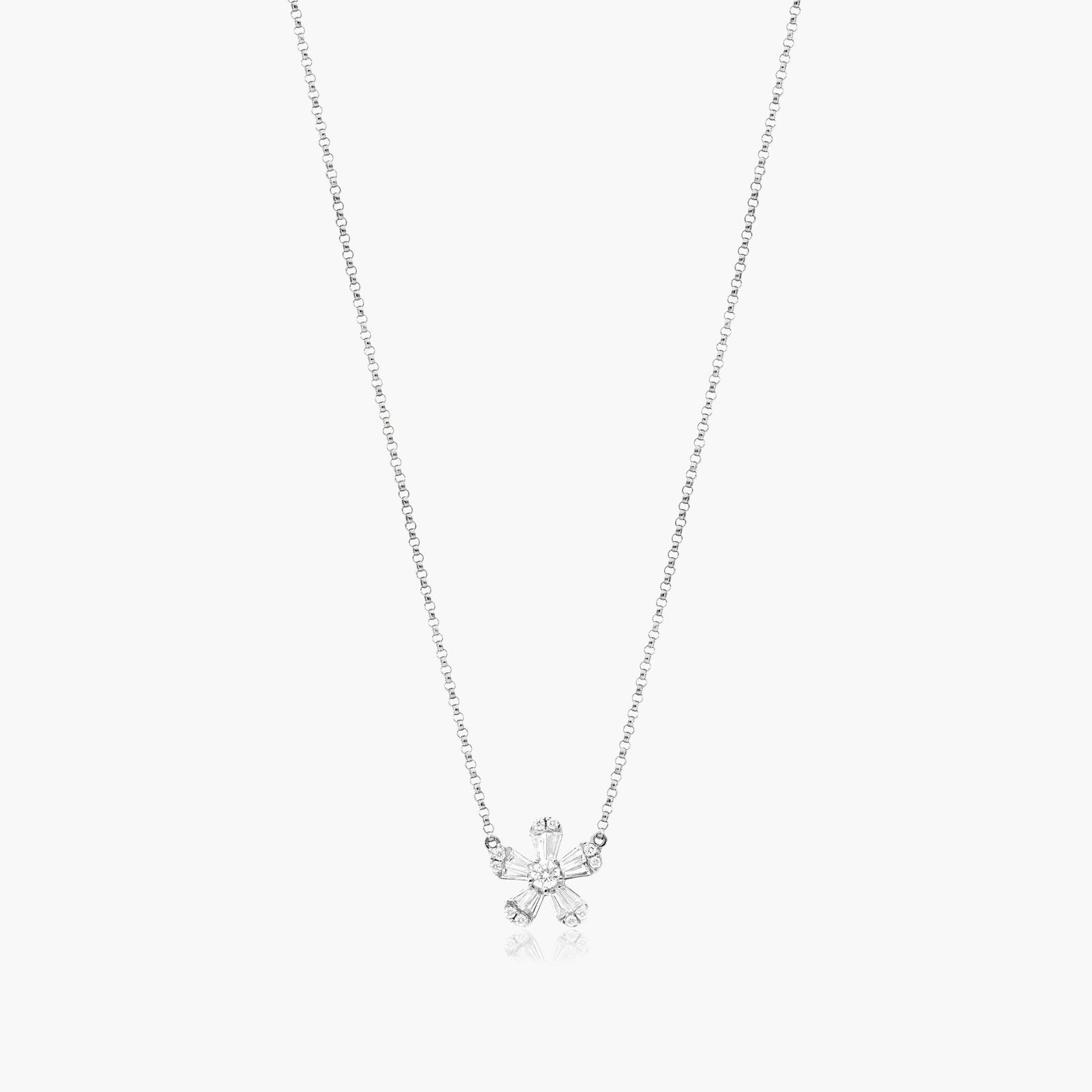 Diamond Flower Necklace With Baguette And Round Diamonds In 14K White Gold