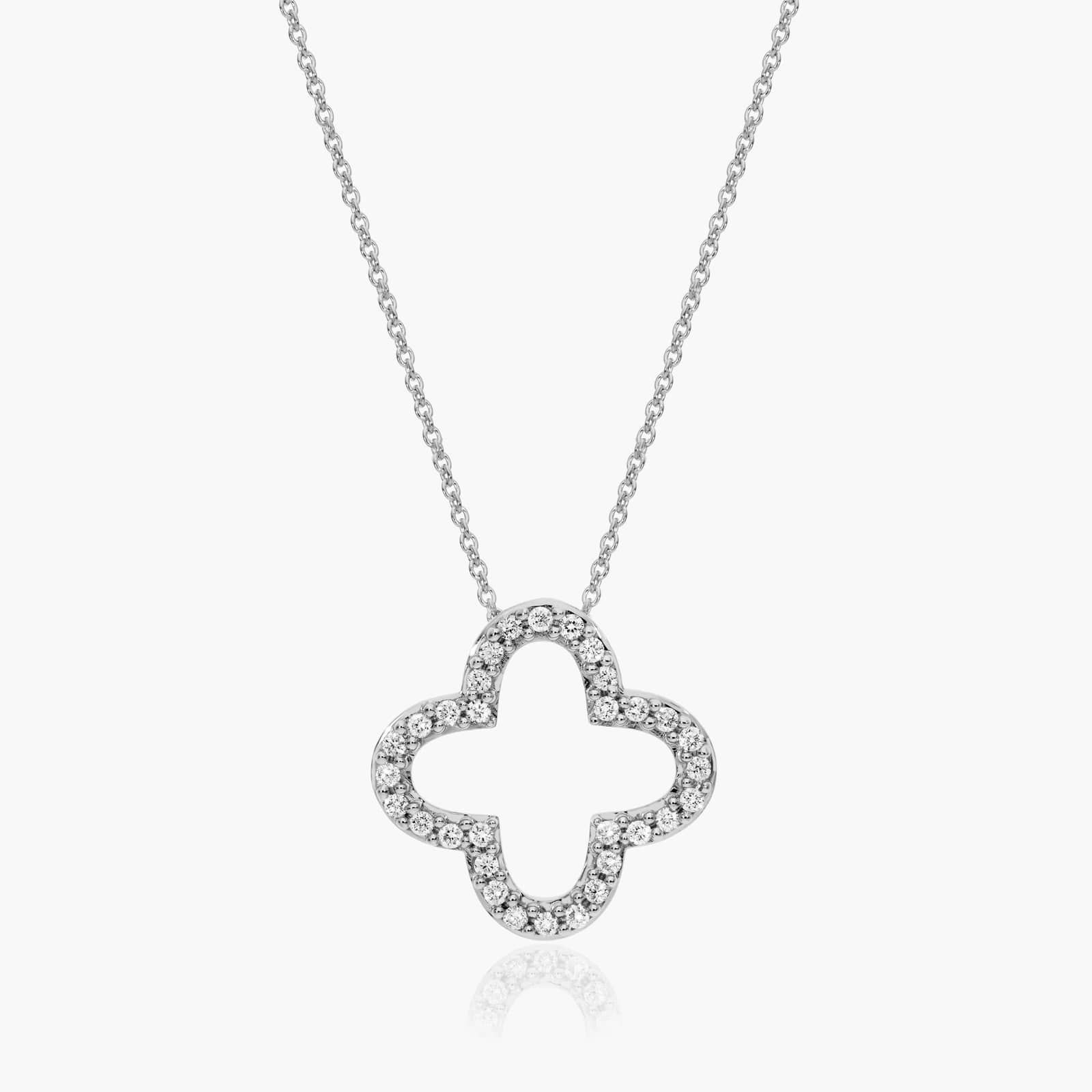 A unique look she’ll adore, this dazzling diamond open clover pendant elevates her attire. Crafted in precious 14K gold, this four leaf clover features a row of diamonds along its edges. This pendant suspends along an 18 inch cable chain with an extra jump ring at 16 inches for versatility and secures with a lobster clasp.