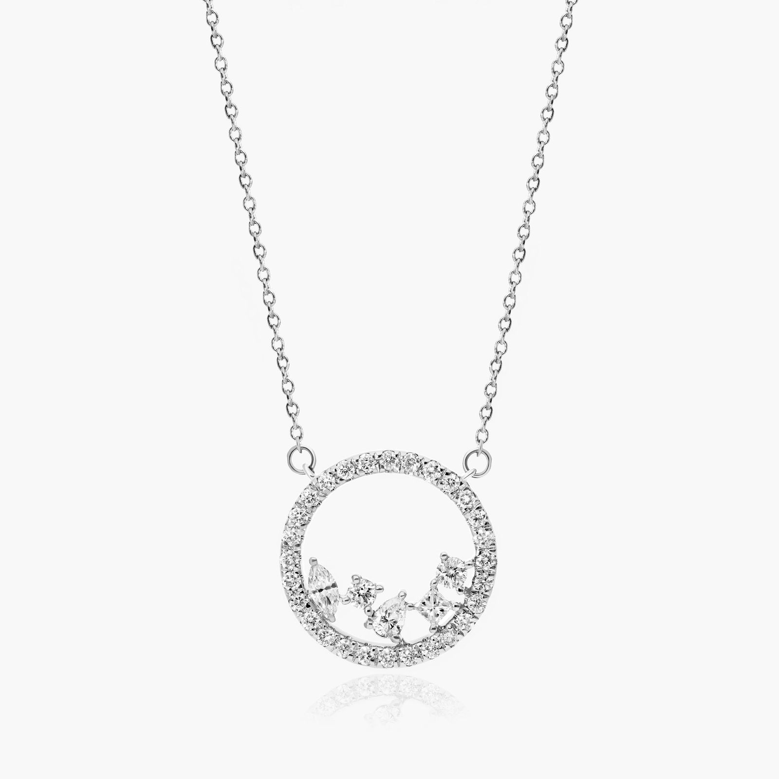 It’s time to shine in this sparkling diamond scatter necklace with round shaped diamonds. Crafted in 14K gold, this dazzler shimmers with a scattering of princess, pear, marquise, and round brilliant cut diamonds inside. This necklace suspends along an 18 inch cable chain with an extra jump ring at 16 inches for versatility and secures with a lobster clasp.