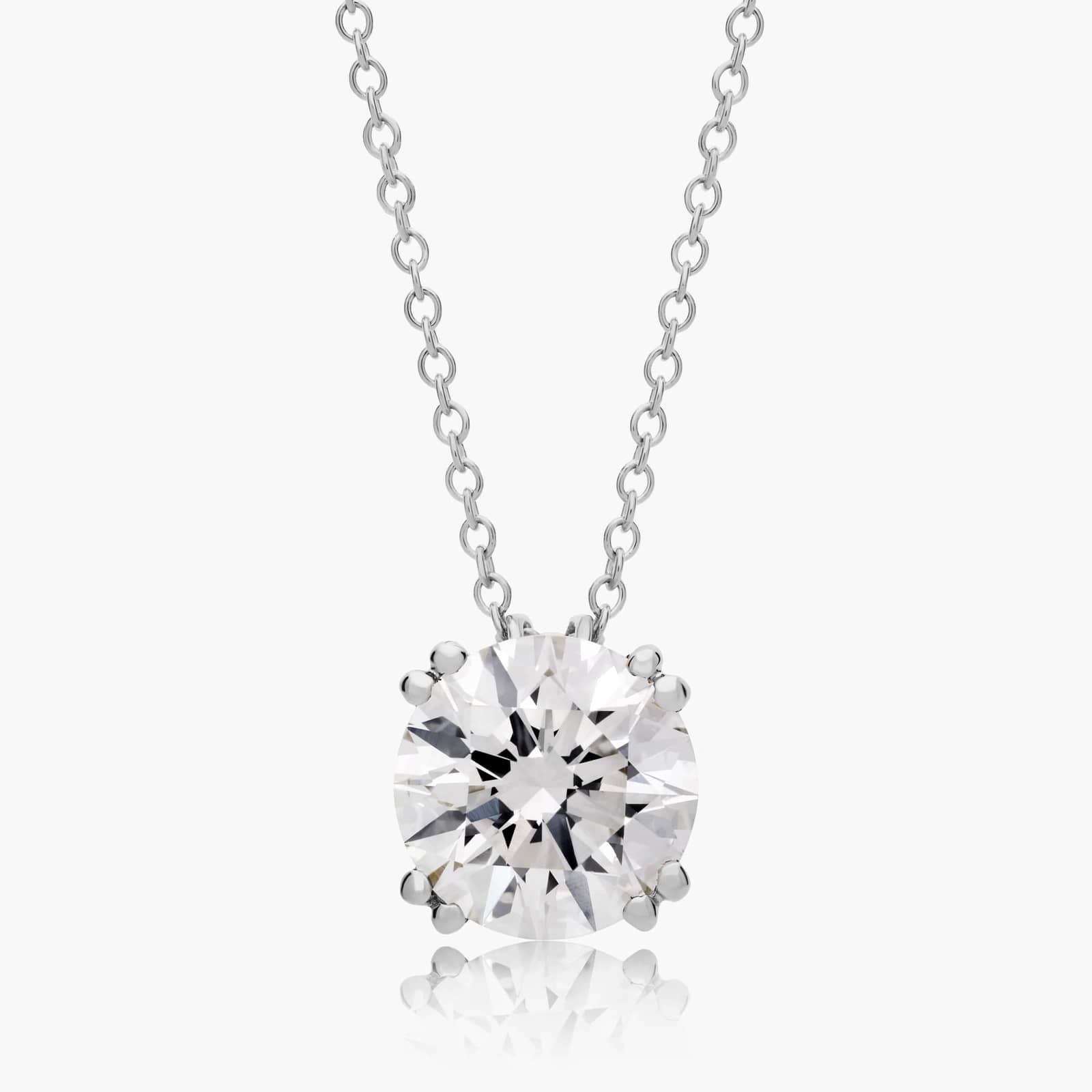 This design is sleek and sophisticated, made to accent the beauty of the round brilliant Lab-Grown diamond of your choice by using split prongs and a tapered wire basket. This pendant comes on an 18 inch chain with a lobster clasp.
