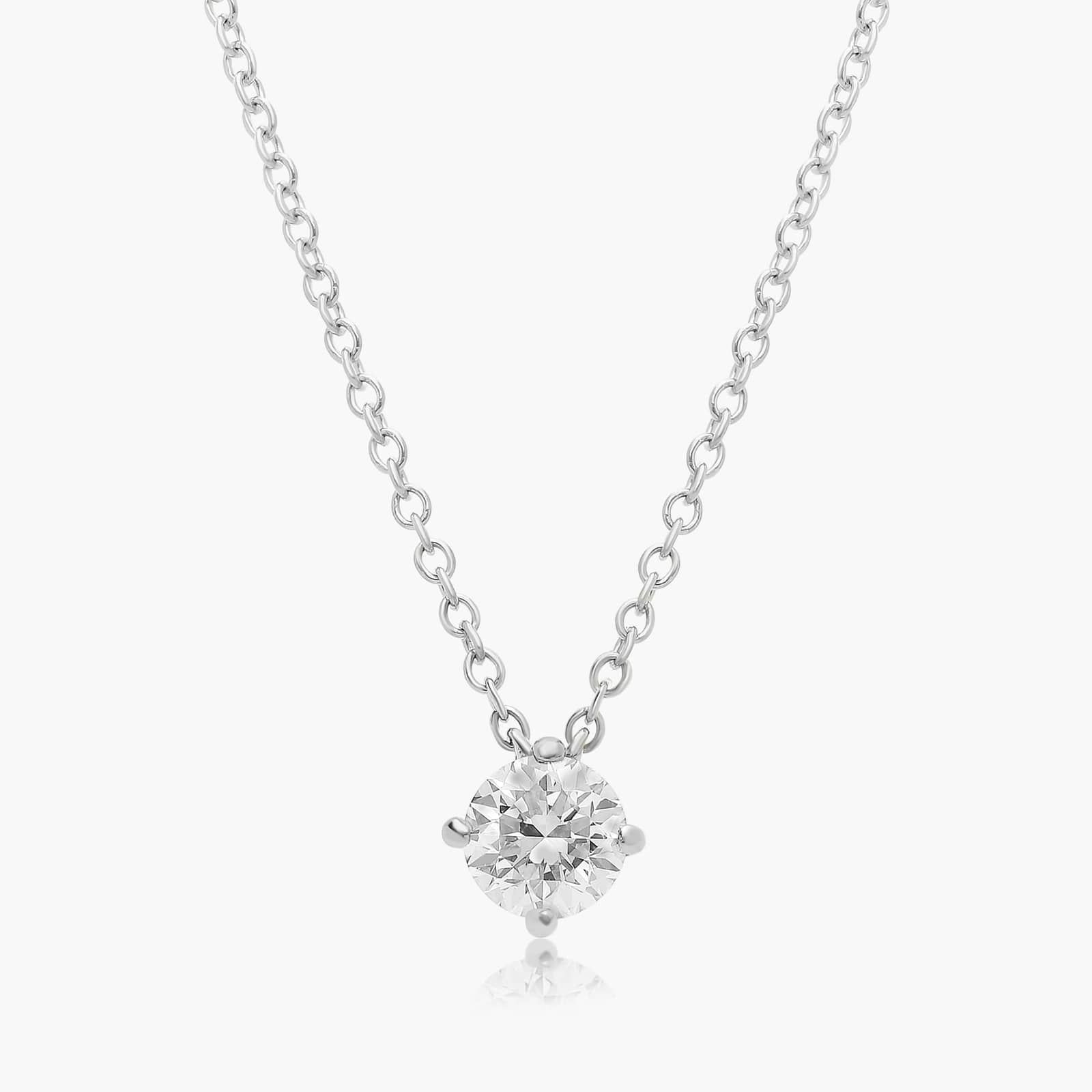 This pendant is designed to showcase the beauty of a round brilliant cut Lab-Grown diamond to its maximum. The finely crafted four prong wire basket pendant features a kite orientation to add a twist to the traditional solitaire necklace.