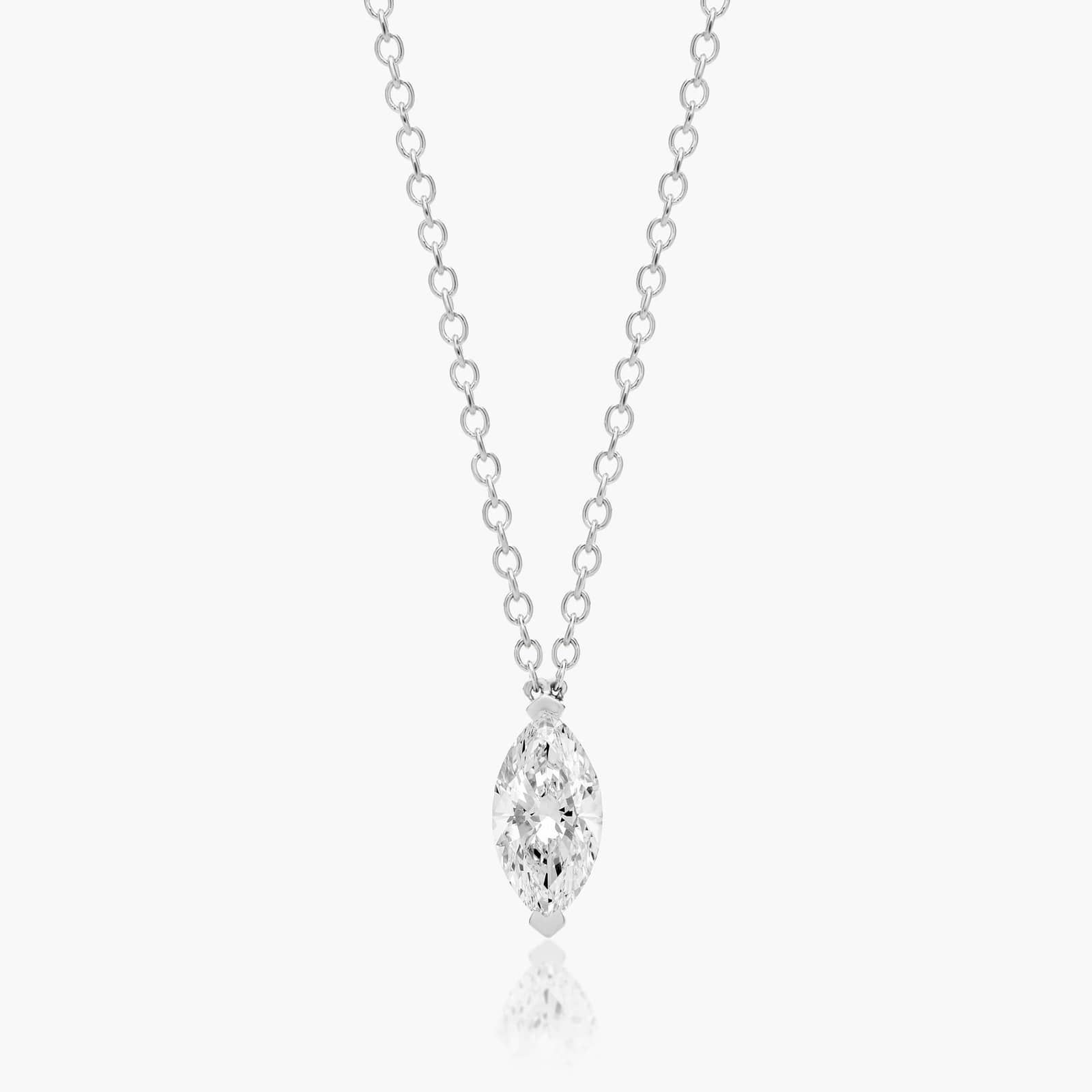This prong wire basket is designed to showcase the unique characteristics of a marquise cut lab-grown diamond. This lovely solitaire pendant is attached to an 18 cable link chain. Truly a classic design that is perfect for any occasion.
