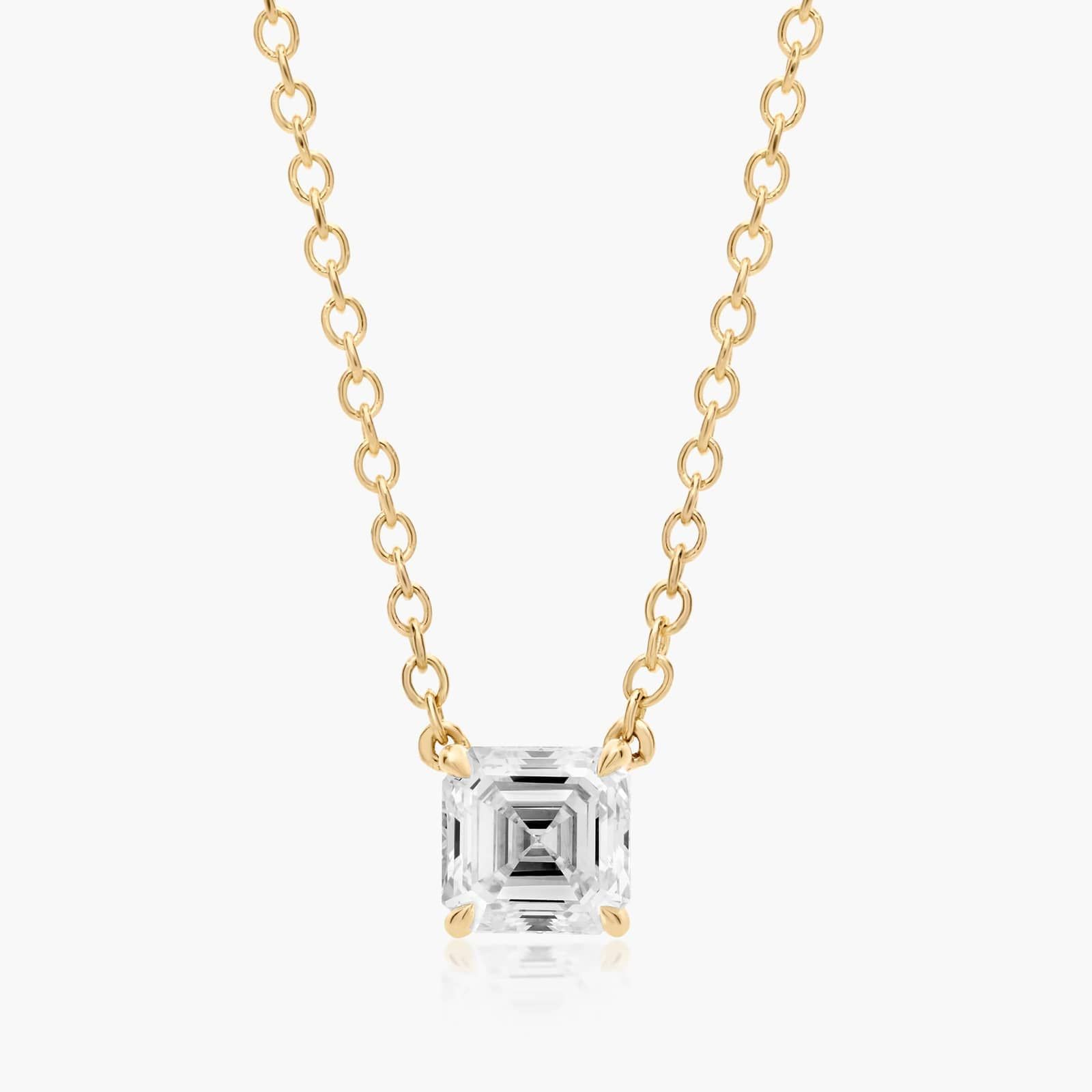 This light four prong wire basket is designed to showcase the unique characteristics of a asscher cut diamond. This lovely solitaire pendant is attached to an 18 cable link chain. Truly a classic design that is perfect for any occasion.
