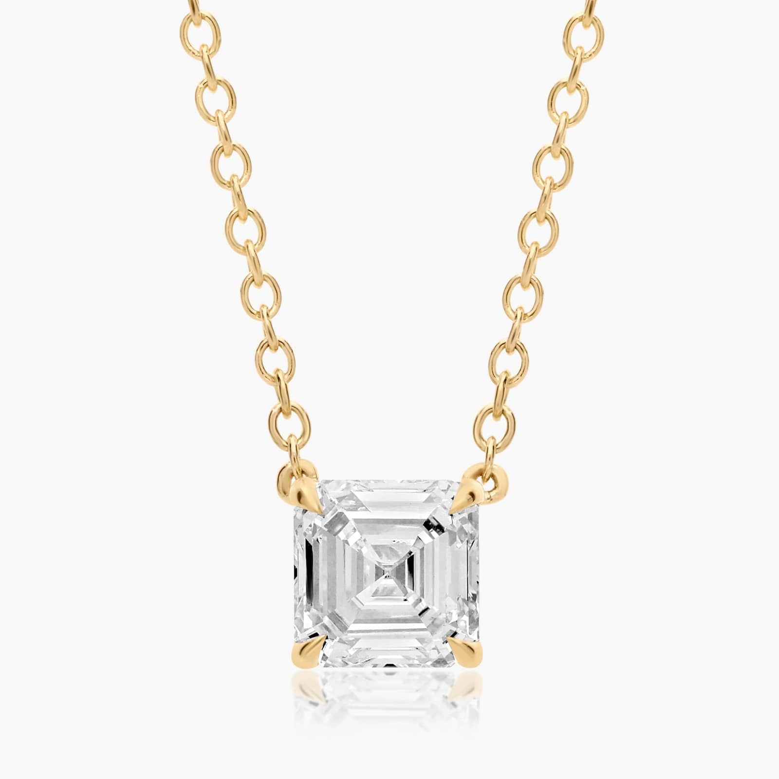 This light four prong wire basket is designed to showcase the unique characteristics of a asscher cut diamond. This lovely solitaire pendant is attached to an 18 cable link chain. Truly a classic design that is perfect for any occasion.