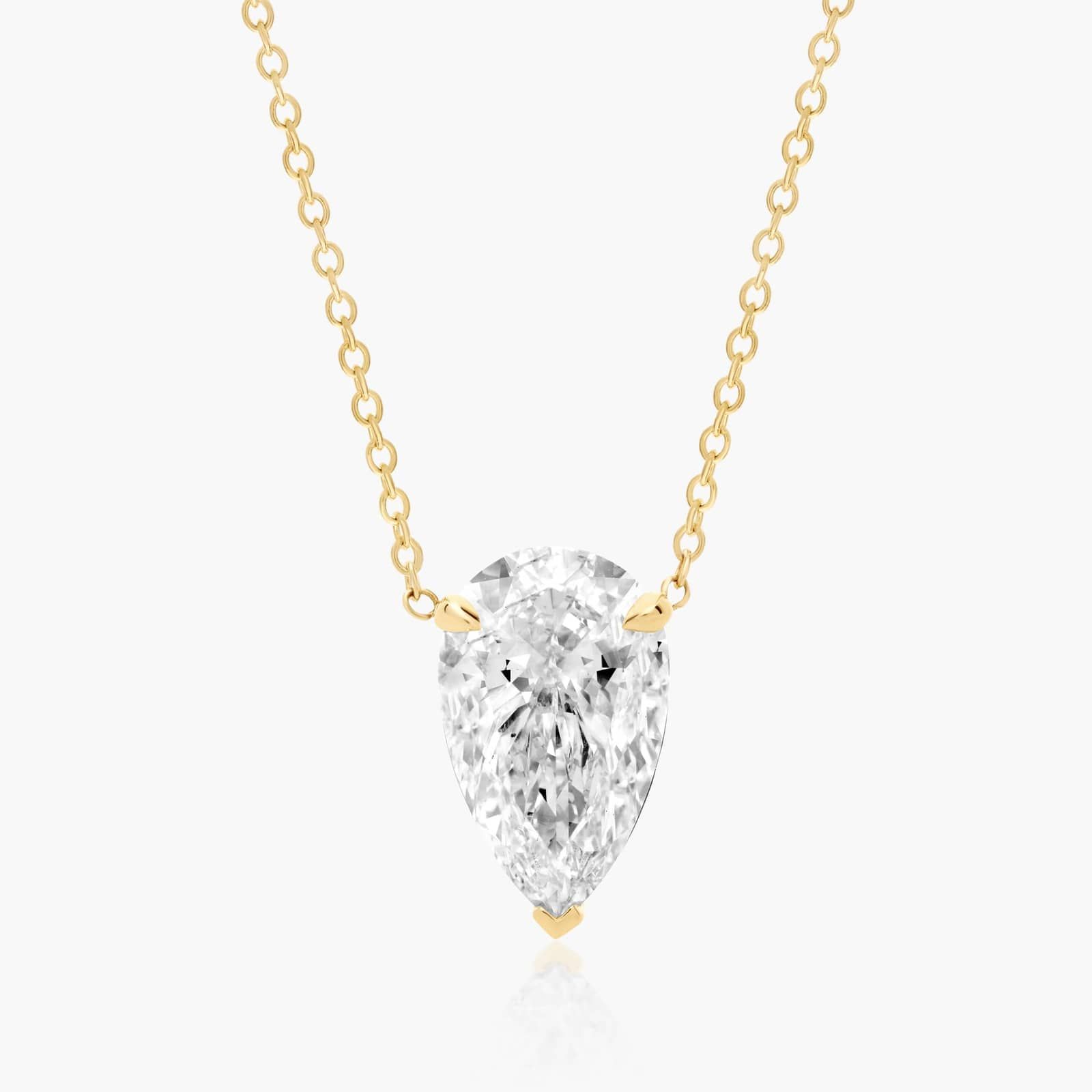 This light wire basket is designed to showcase the unique characteristics of a pear shaped lab-grown diamond. This lovely solitaire pendant is attached to an 18 cable link chain. Truly a classic design that is perfect for any occasion.