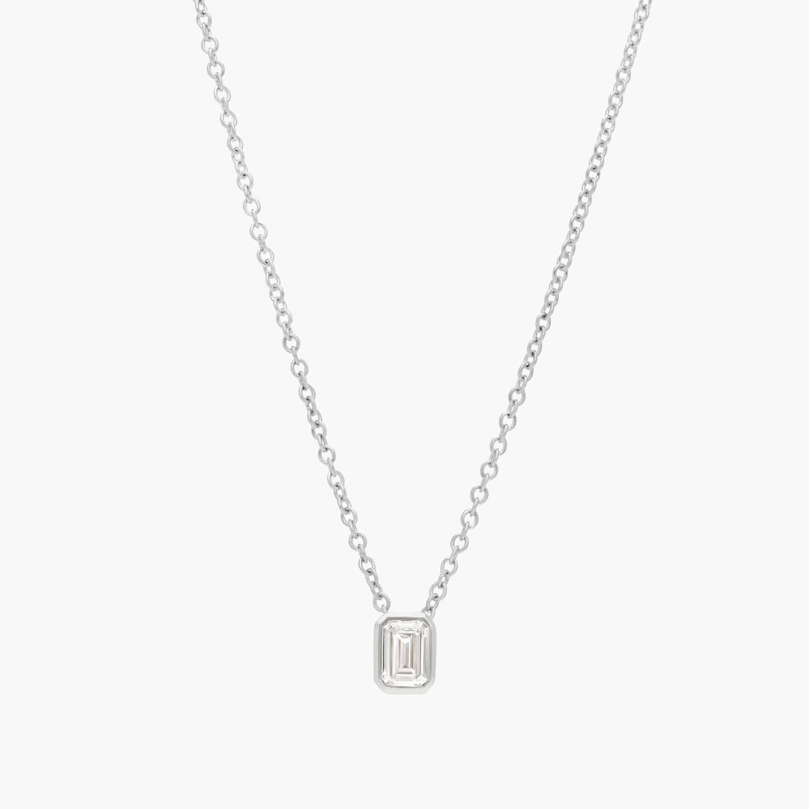This emerald cut diamond solitaire pendant is as classic as it gets. With platinum design and bezel details, it can be worn alone or in a layered look.