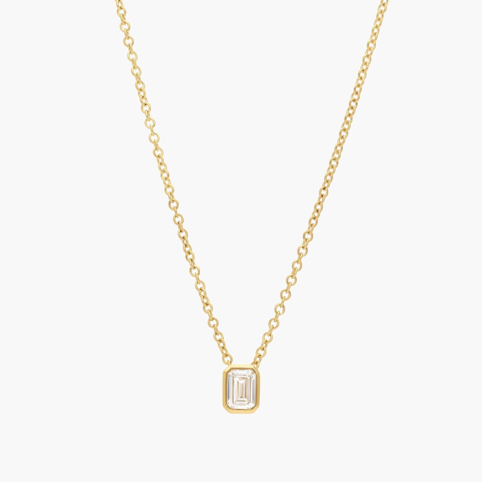 This emerald cut lab-grown diamond solitaire pendant is as classic as it gets. With 14k yellow gold design and bezel details, it can be worn alone or in a layered look.