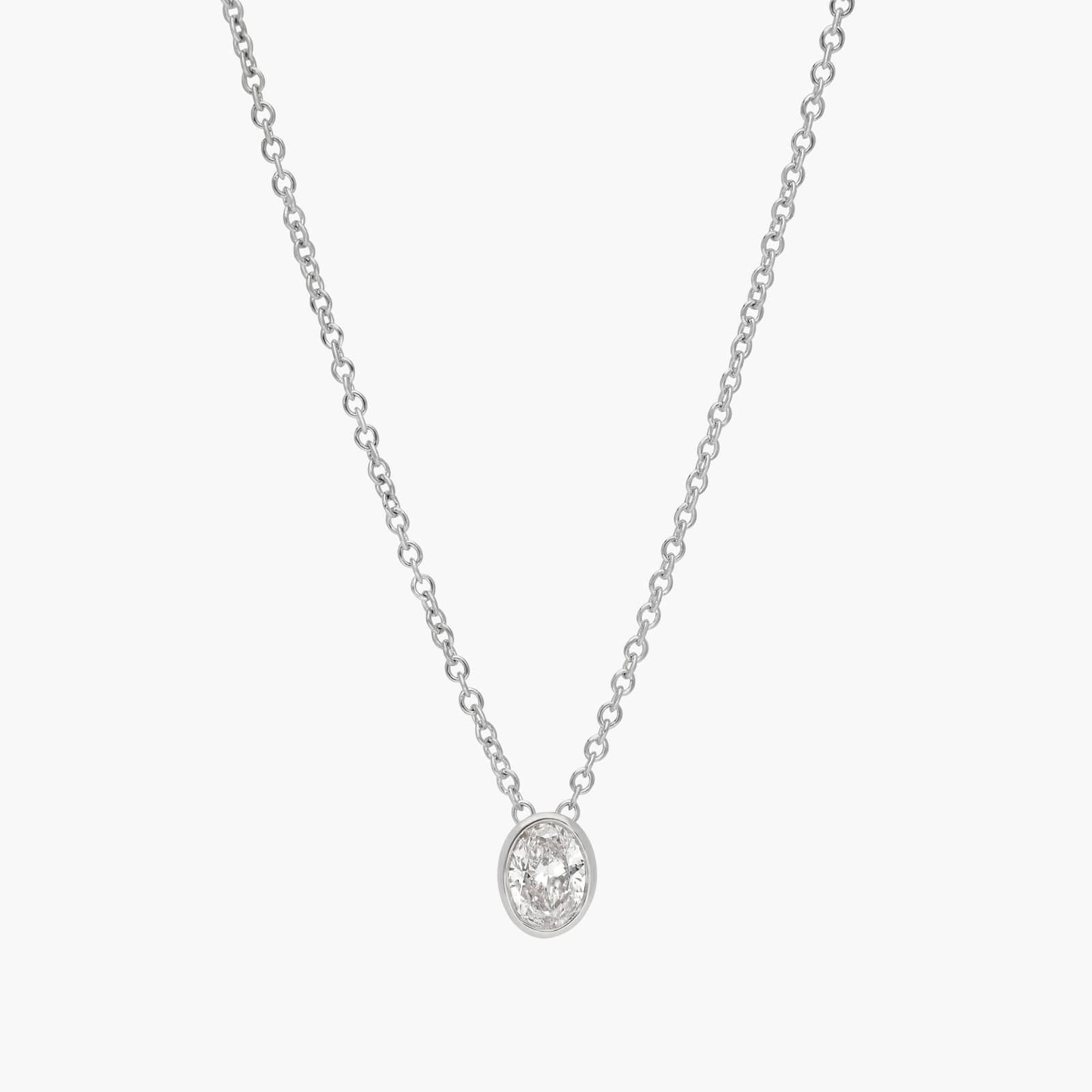 Wear this oval cut bezel set diamond solitaire pendant for a unique take on classic brilliance. This platinum oval diamond necklace is perfect for stacking, solo styling and gifting.