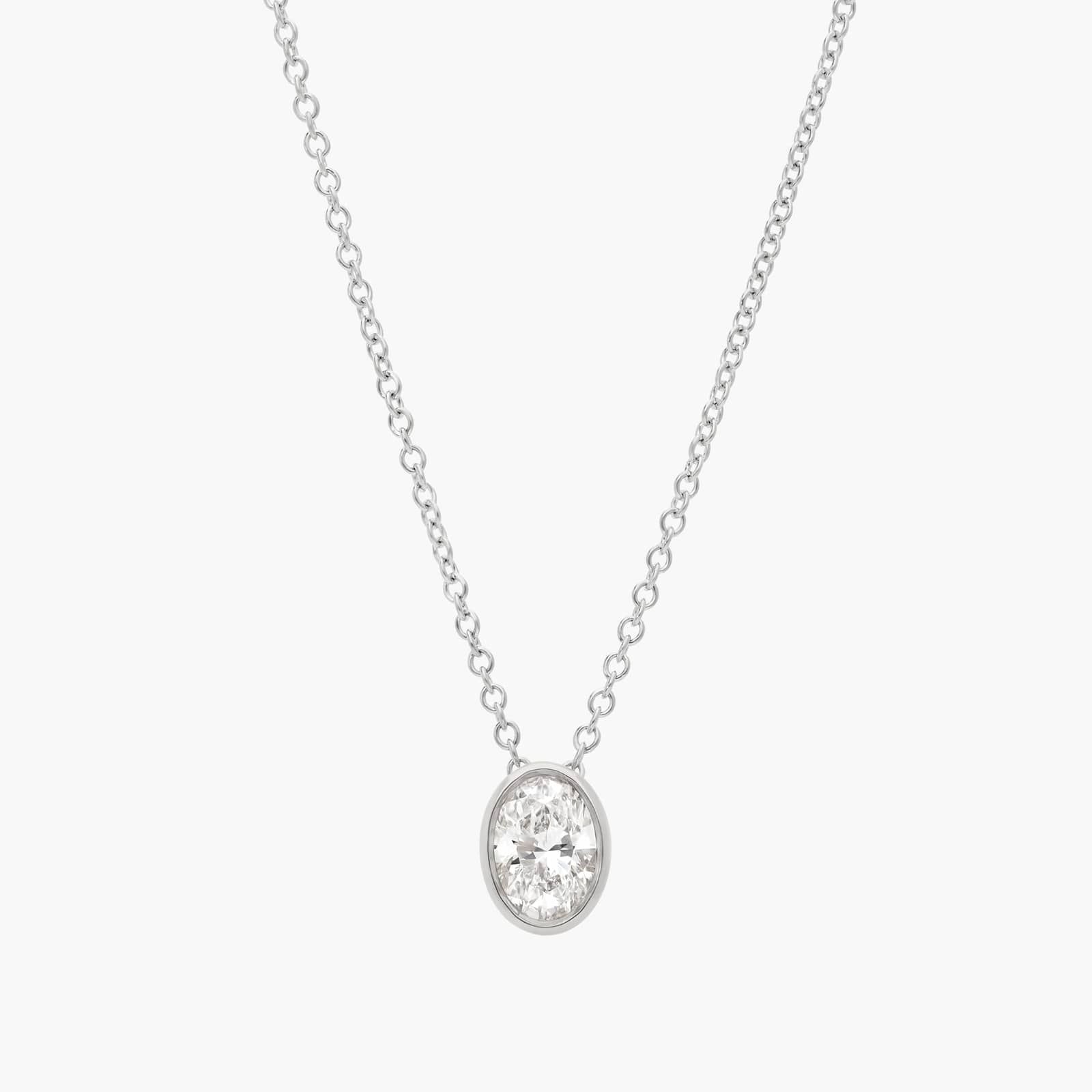Wear this oval cut bezel set diamond solitaire pendant for a unique take on classic brilliance. This platinum oval diamond necklace is perfect for stacking, solo styling and gifting.