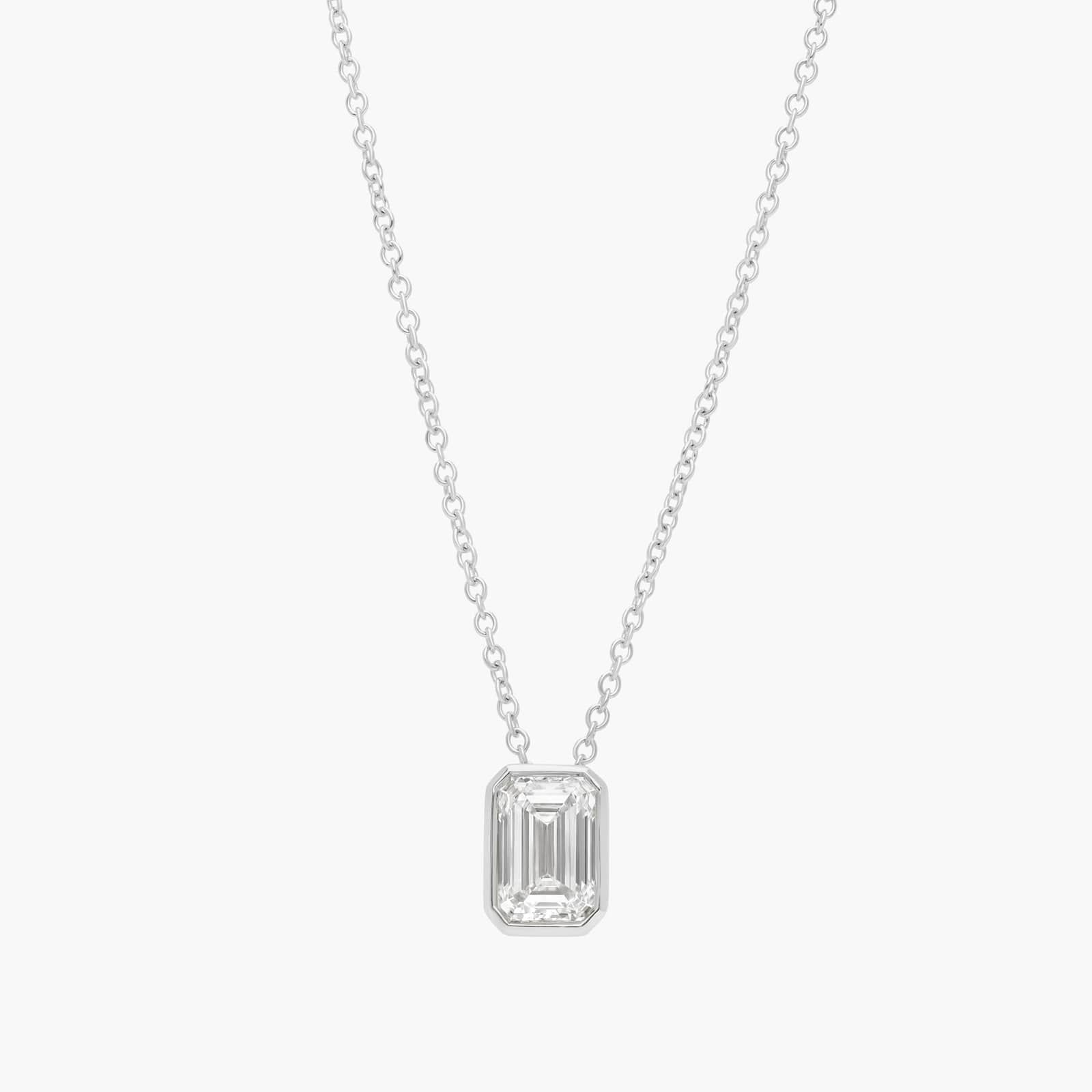 This emerald cut lab-grown diamond solitaire pendant is as classic as it gets. With 14k white gold design and bezel details, it can be worn alone or in a layered look.