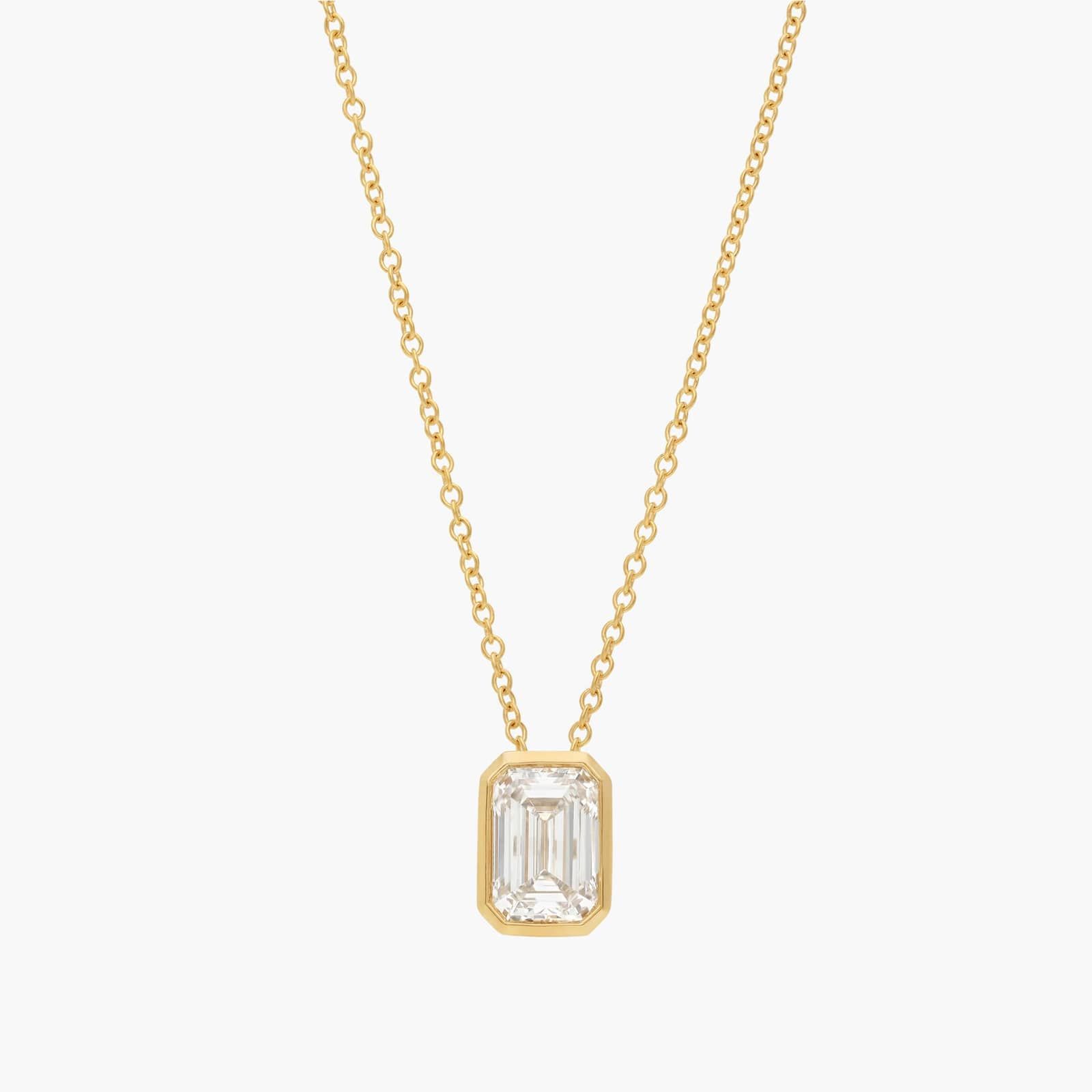 This emerald cut lab-grown diamond solitaire pendant is as classic as it gets. With 14k yellow gold design and bezel details, it can be worn alone or in a layered look.