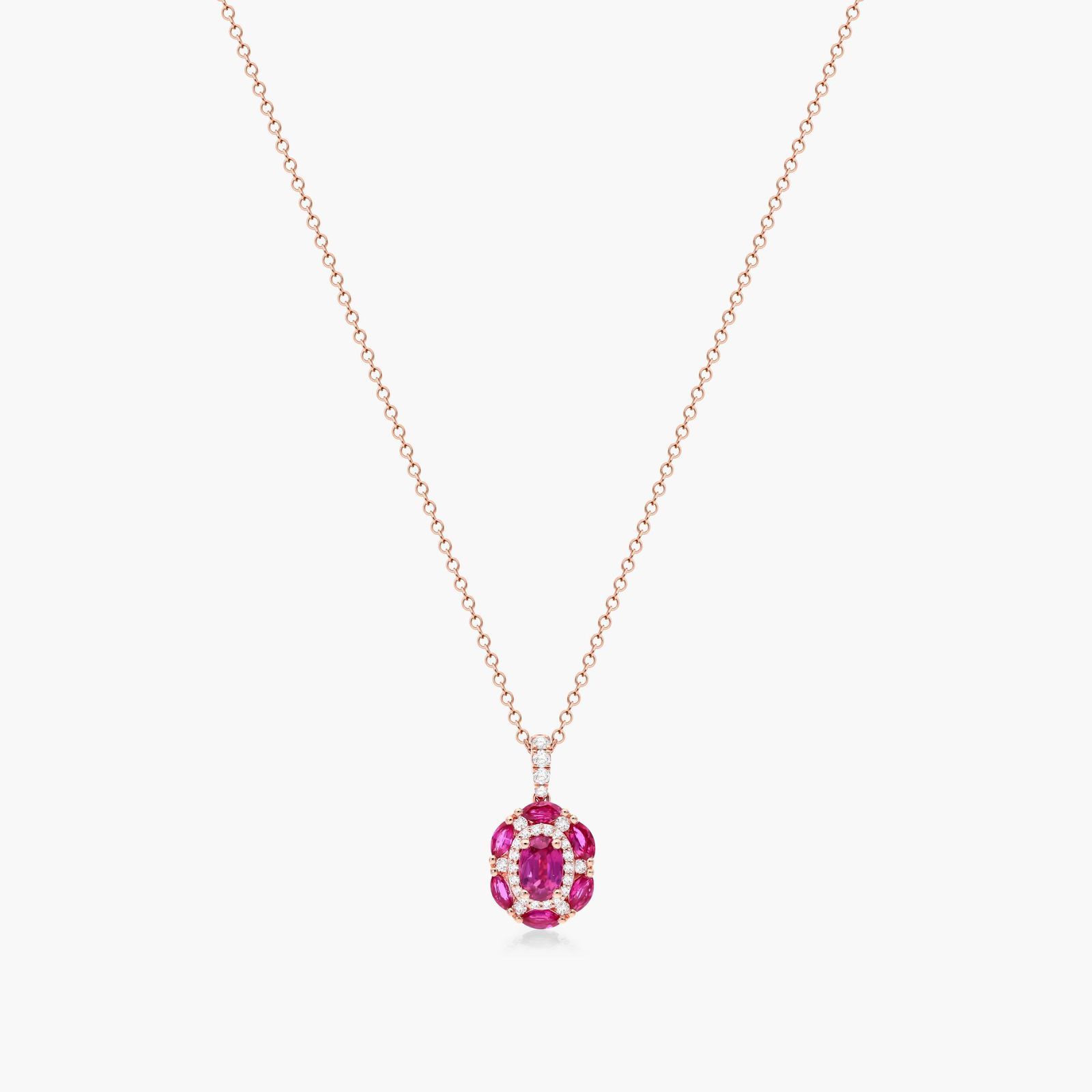 If you are looking for something truly luxurious, look no further! This stunning necklace features an oval center ruby surrounded by sparkly diamonds and an outer marquise ruby halo.