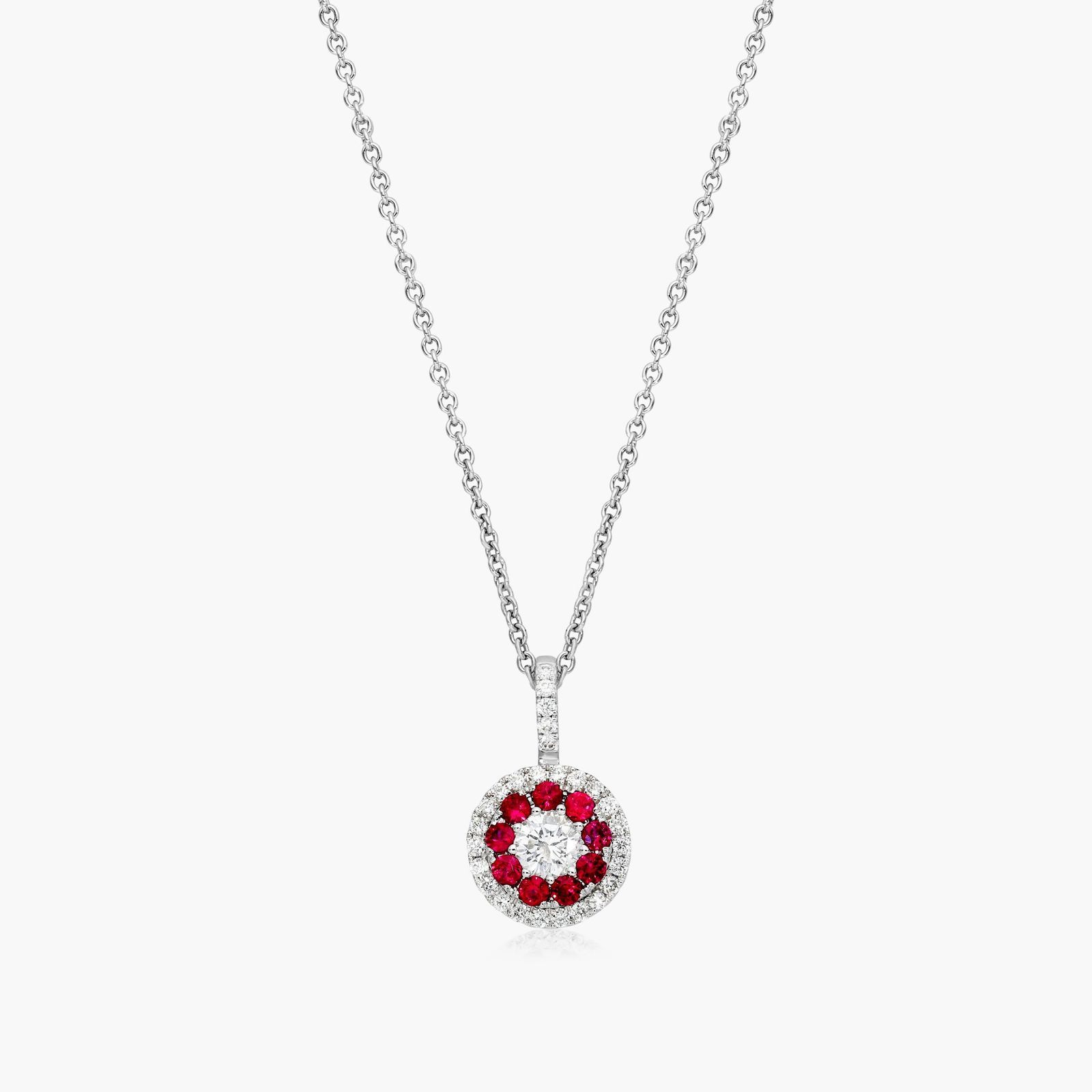 Emphasize the ultimate luxury and rich color of rubies with the natural beauty of diamonds. This pendant features alternating circles of diamonds and rubies set in 14k white gold for a classic look with a stunning pop of color.