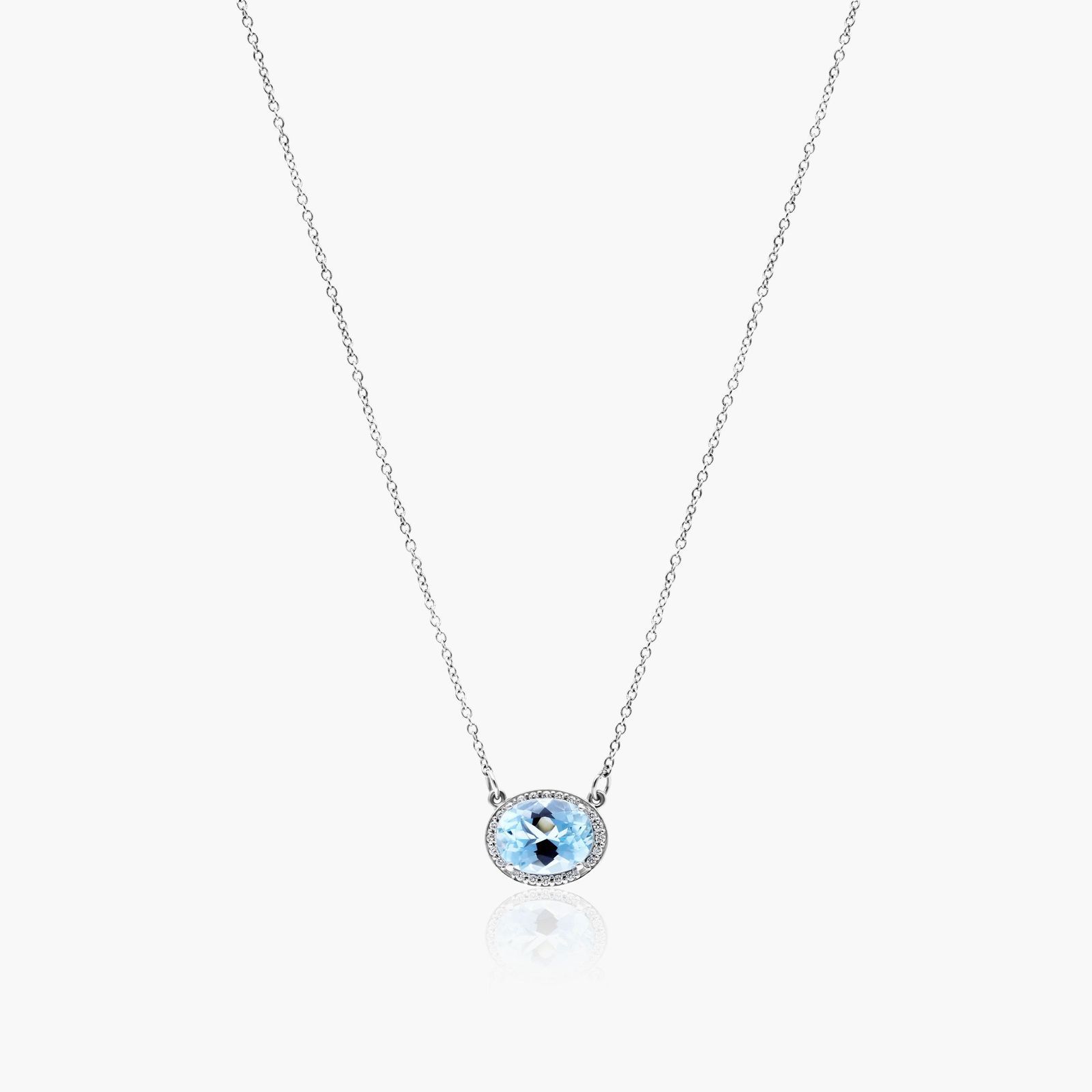 With just the perfect touch of color, this 9.0mm x 7.0mm aquamarine is set east to west in a simple diamond halo setting. At a 16.5" length, it is the perfect length for any outfit!