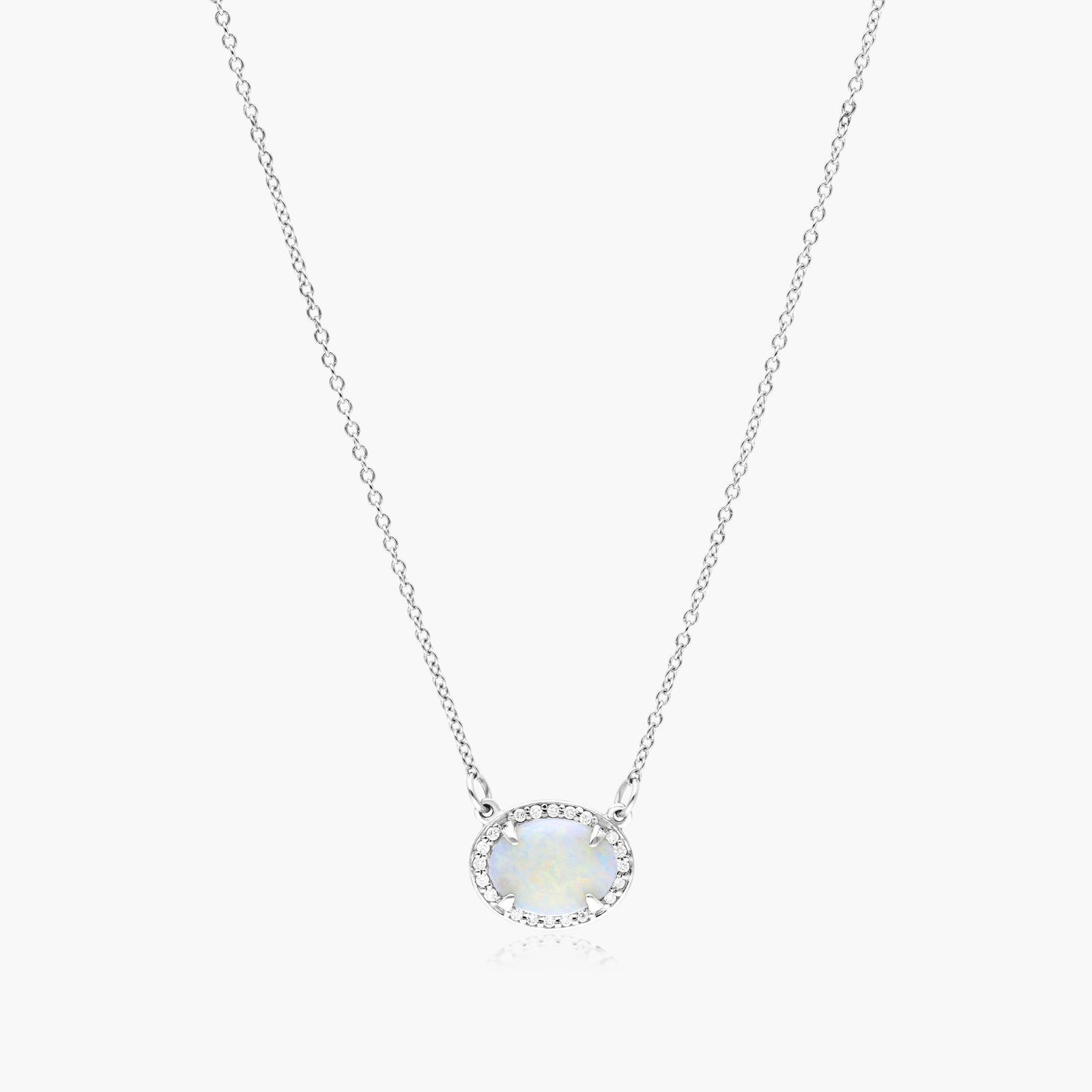 14K White Gold East West Oval White Opal and Diamond Halo Necklace