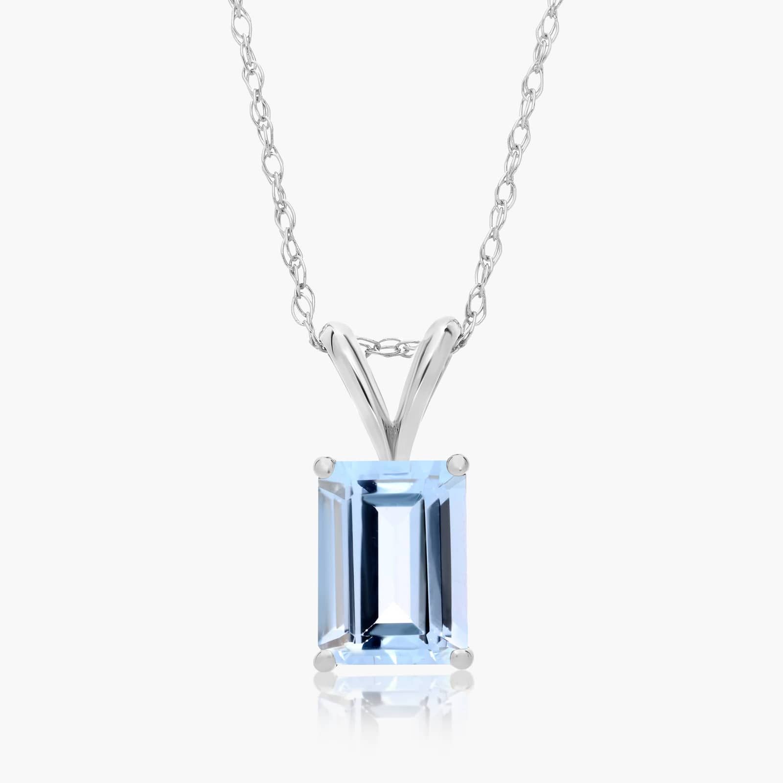 14K White Gold Emerald Cut Aquamarine Birthstone Pendant Necklace