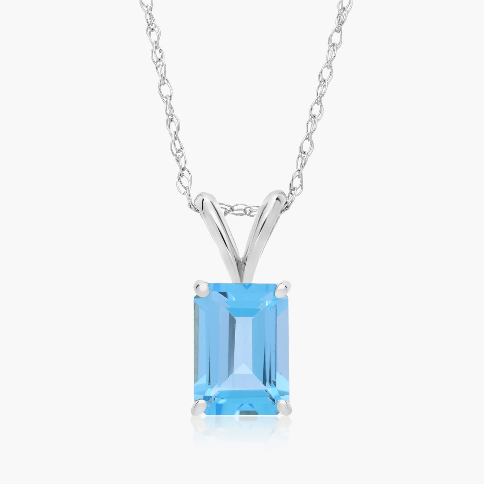 14K White Gold Emerald Cut Swiss Blue Topaz Birthstone Pendant Necklace