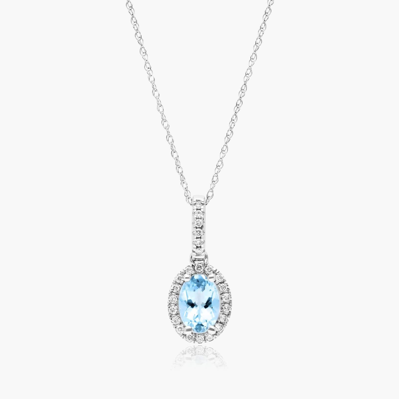 14K White Gold Oval Halo Aquamarine and Diamond Necklace