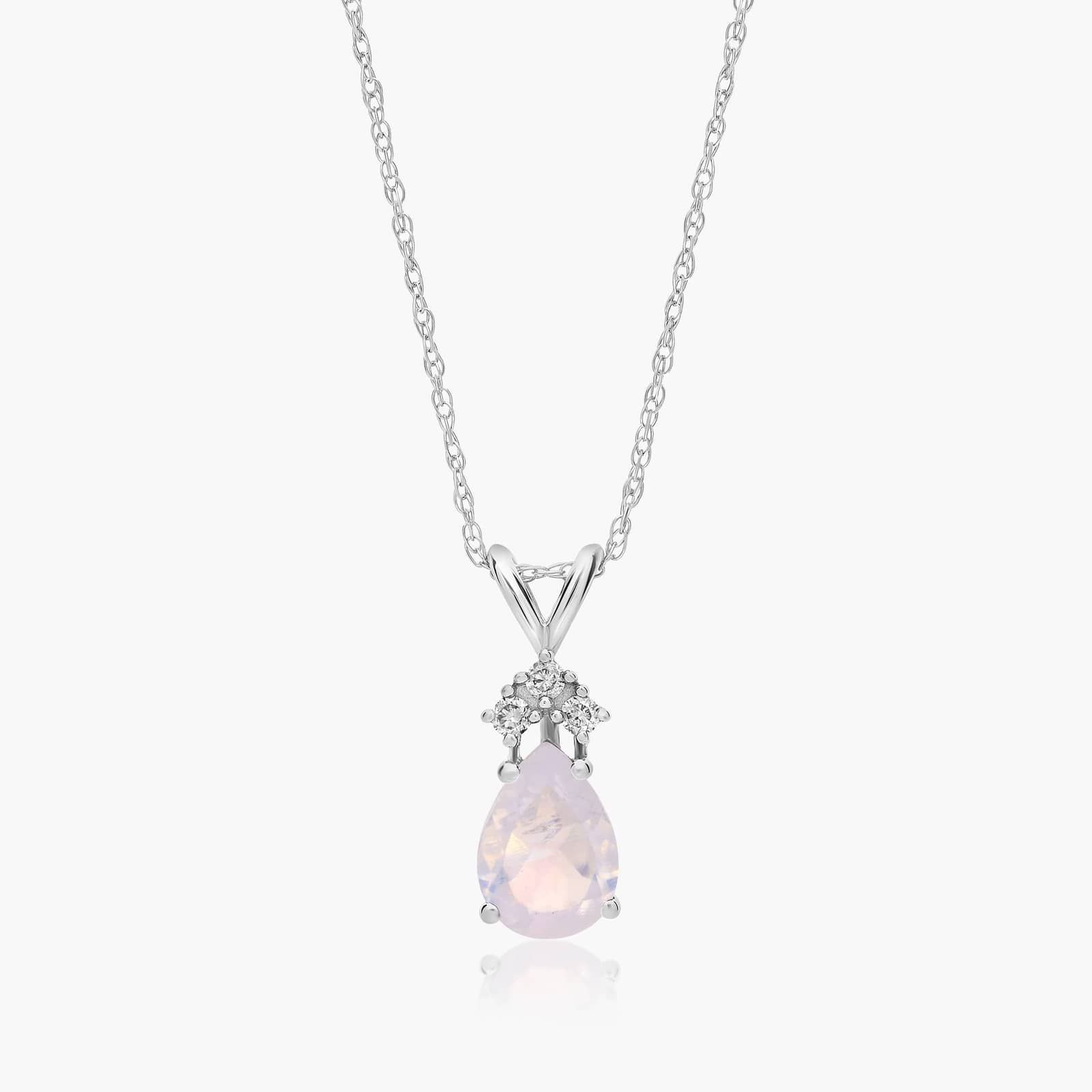 14K White Gold Pear Shaped Rainbow Moonstone & Tri-Diamond Birthstone Pendant Necklace