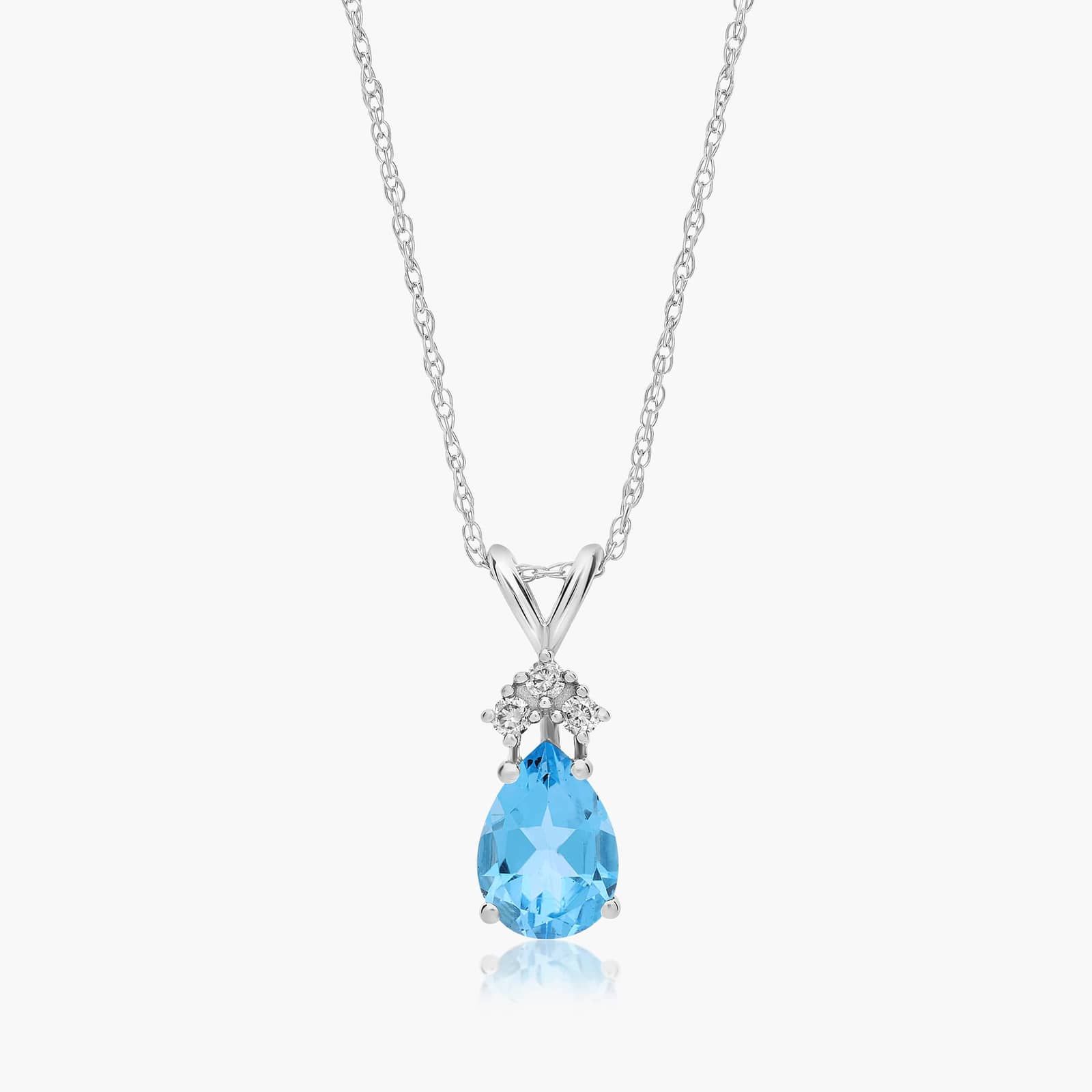 14K White Gold Pear Shaped Swiss Blue Topaz & Tri-Diamond Birthstone Pendant Necklace