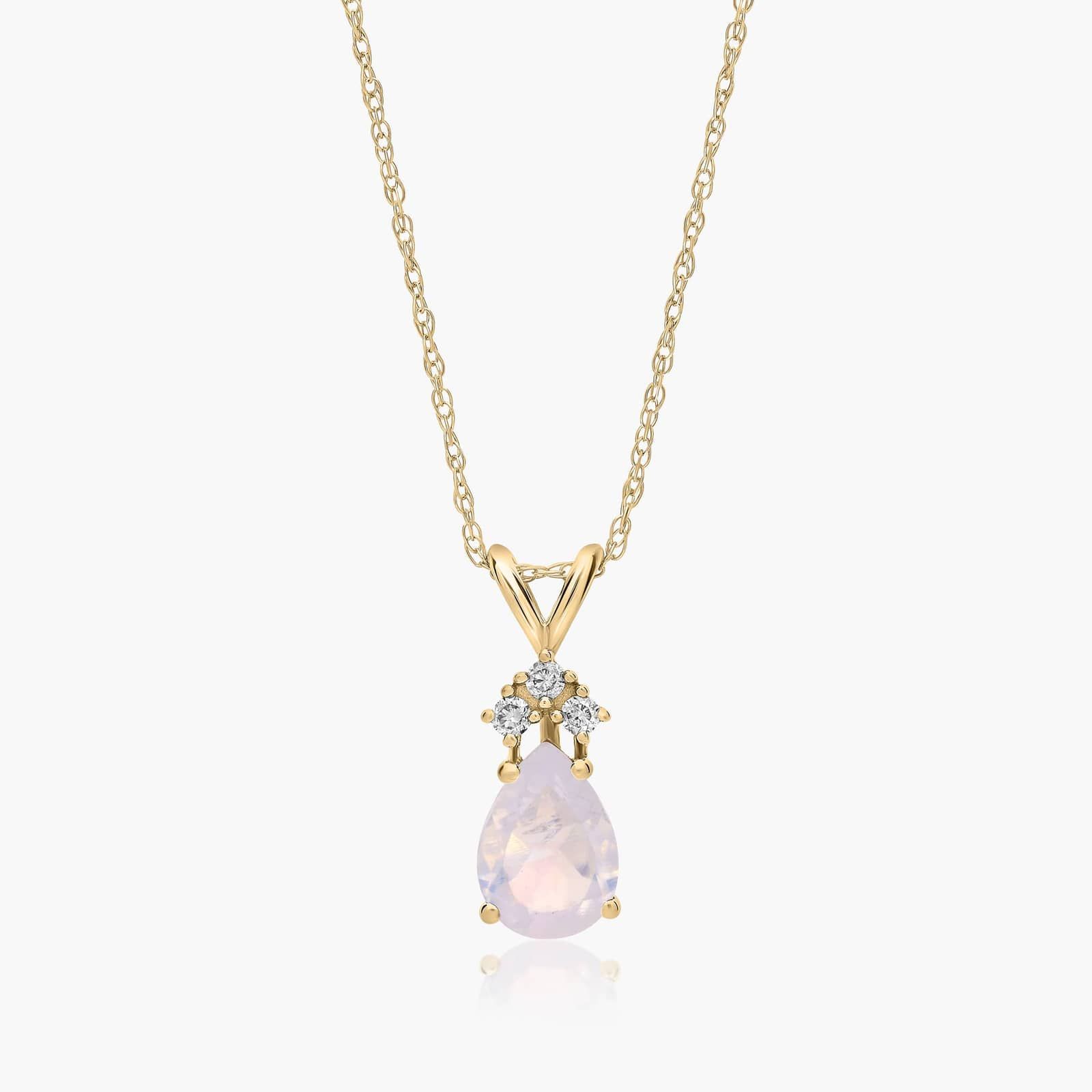 14K Yellow Gold Pear Shaped Rainbow Moonstone & Tri-Diamond Birthstone Pendant Necklace