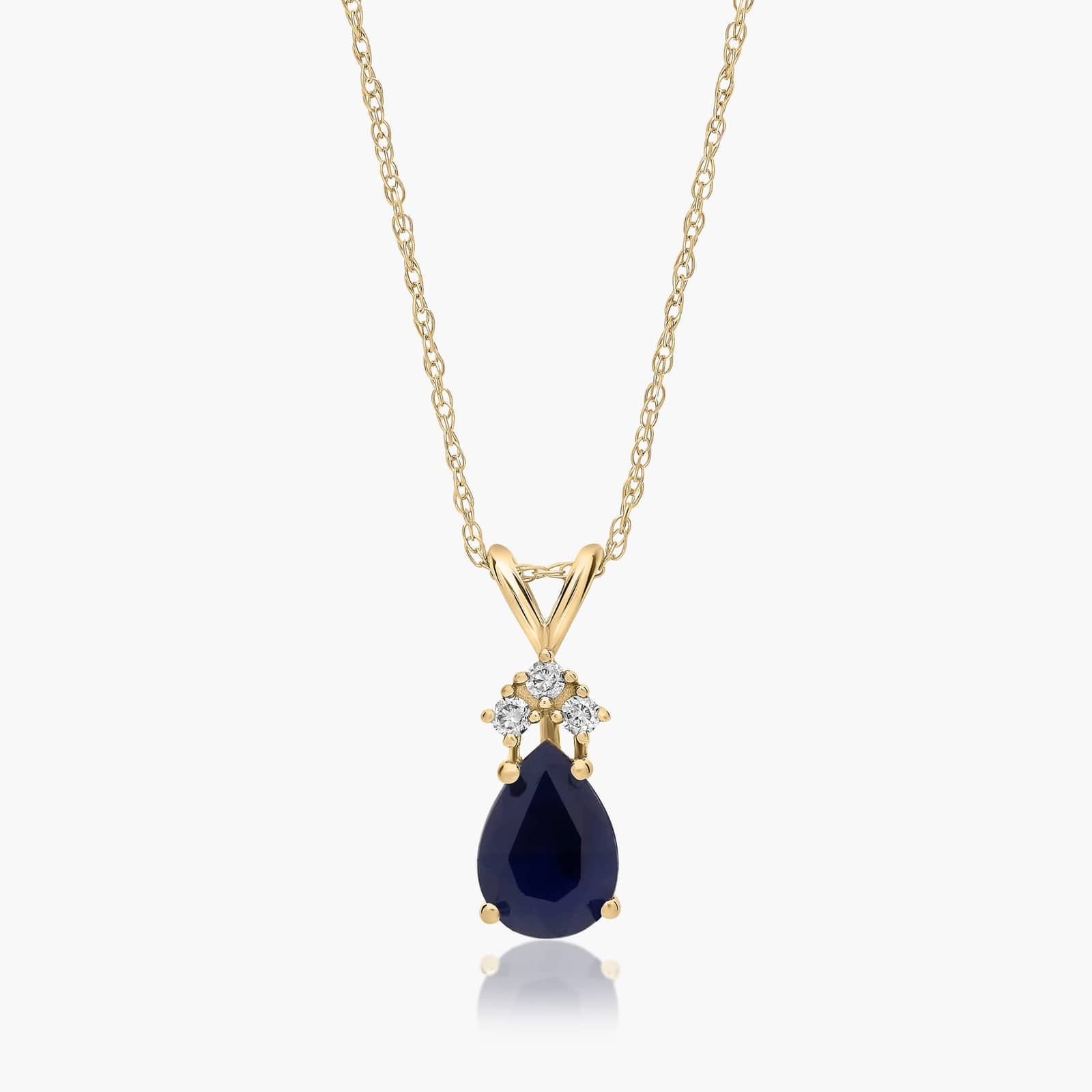 14K Yellow Gold Pear Shaped Sapphire & Tri-Diamond Birthstone Pendant Necklace