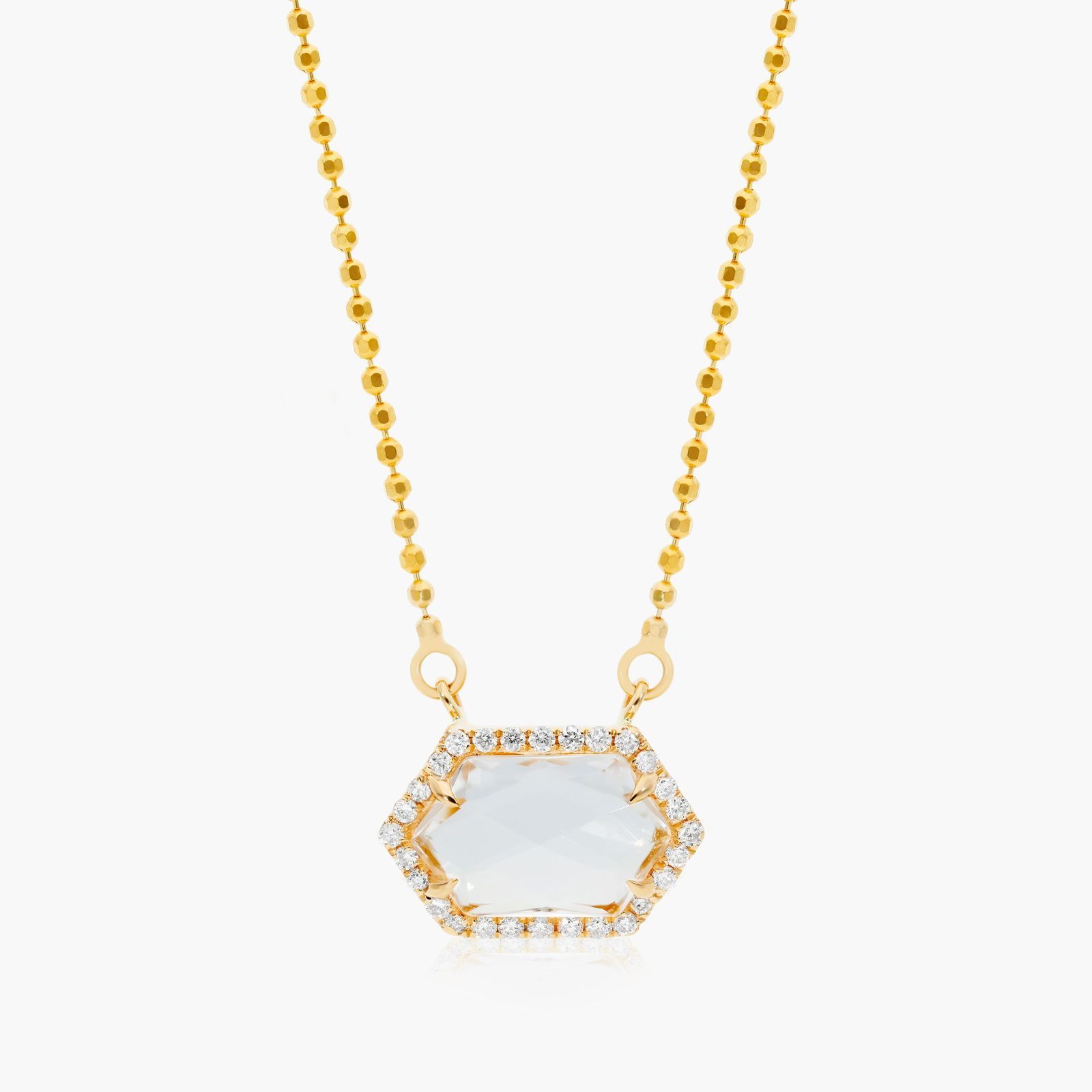 14K Yellow Gold White Topaz Hexagon With Diamond Halo Necklace by Brevani