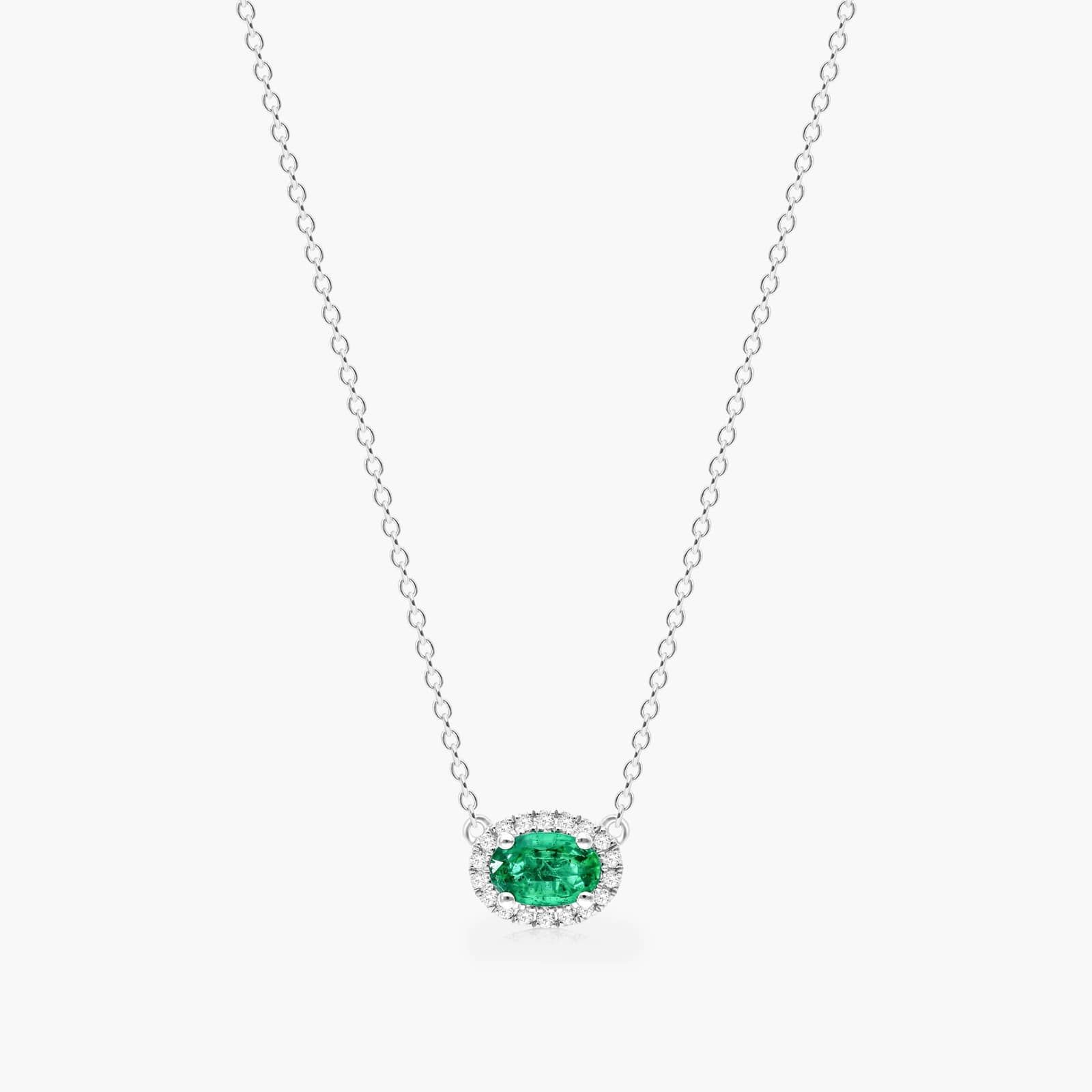 18K White Gold East West Set Oval Halo Emerald and Diamond Necklace (6.0x4.0mm)