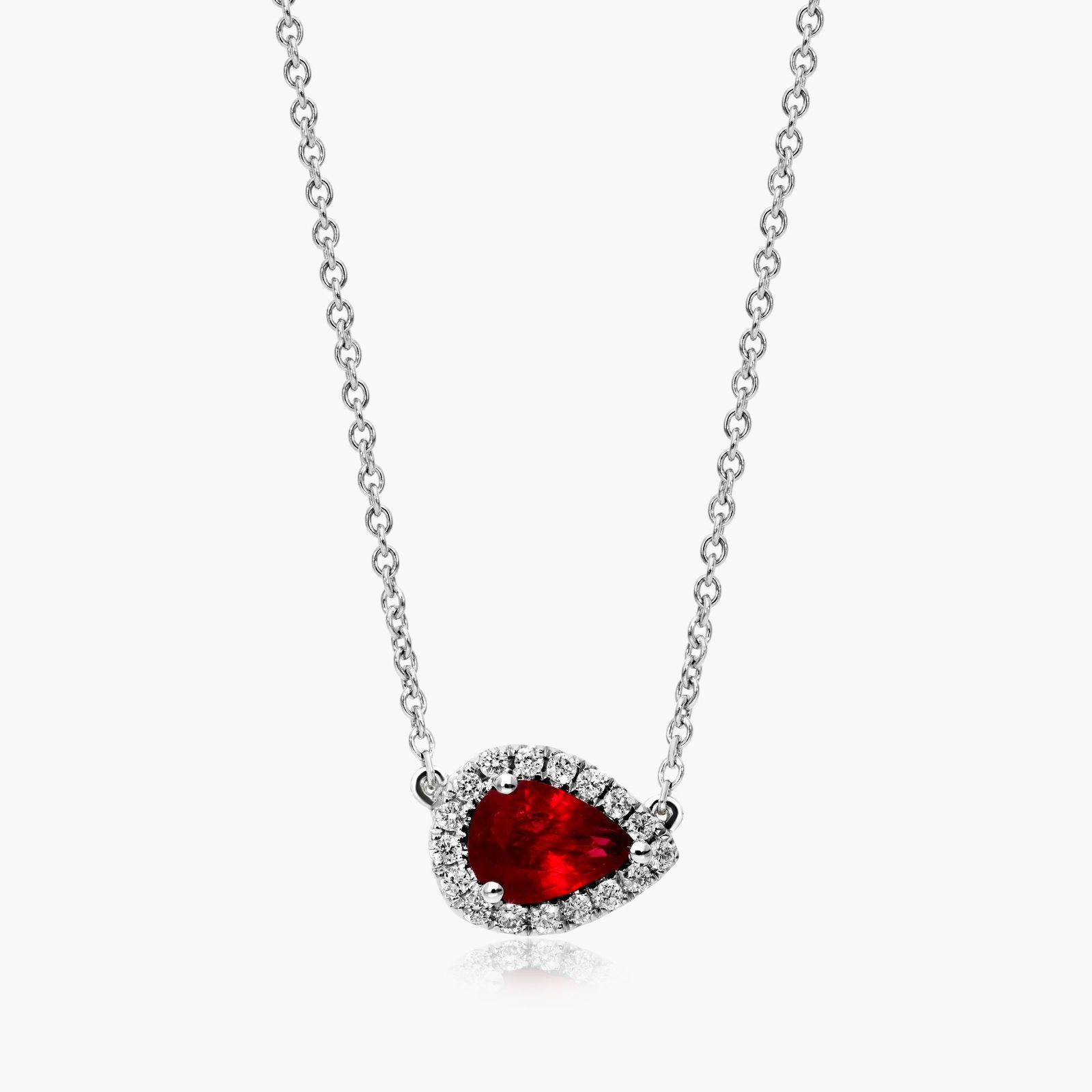 18K White Gold Sideways Pear Ruby and Diamond Halo Necklace